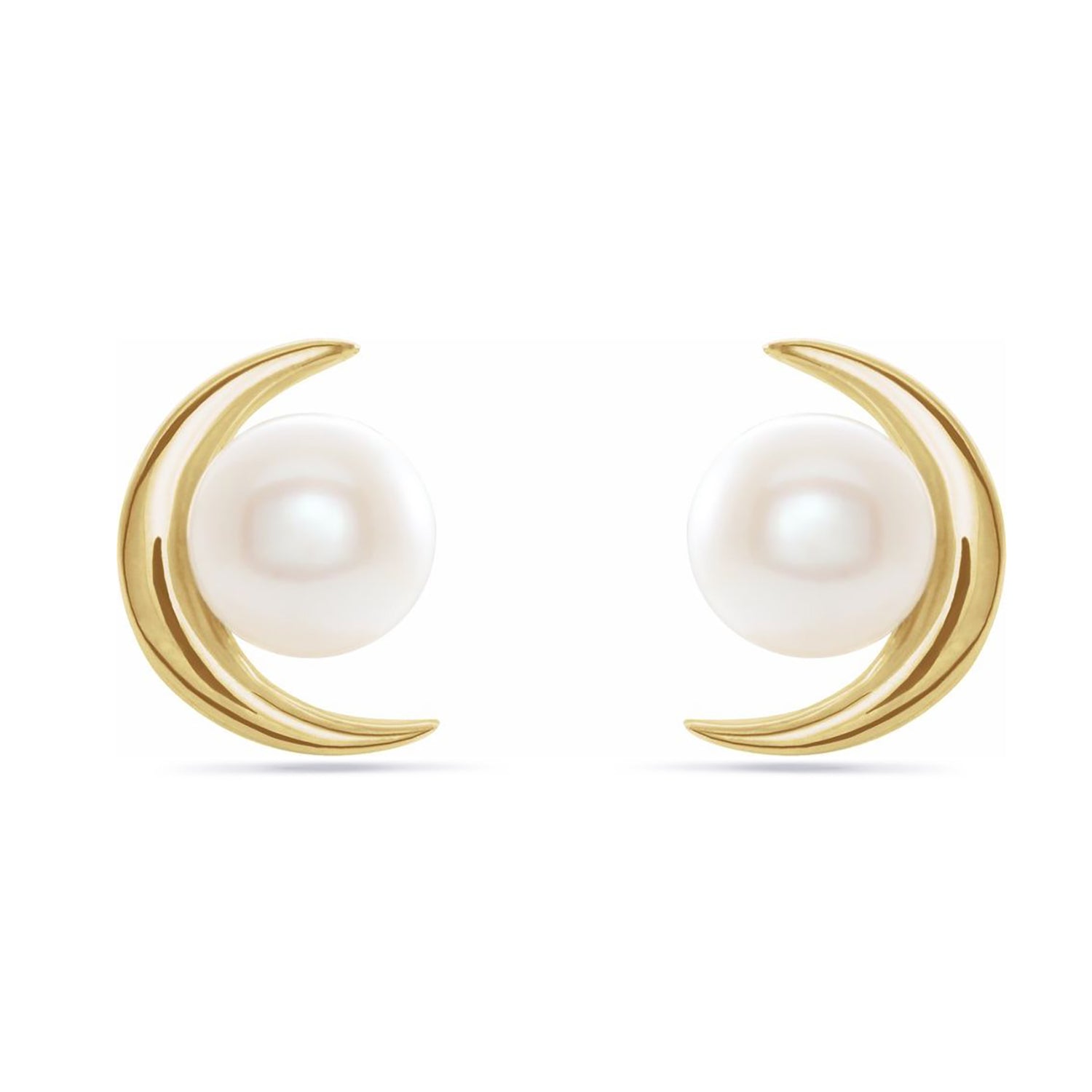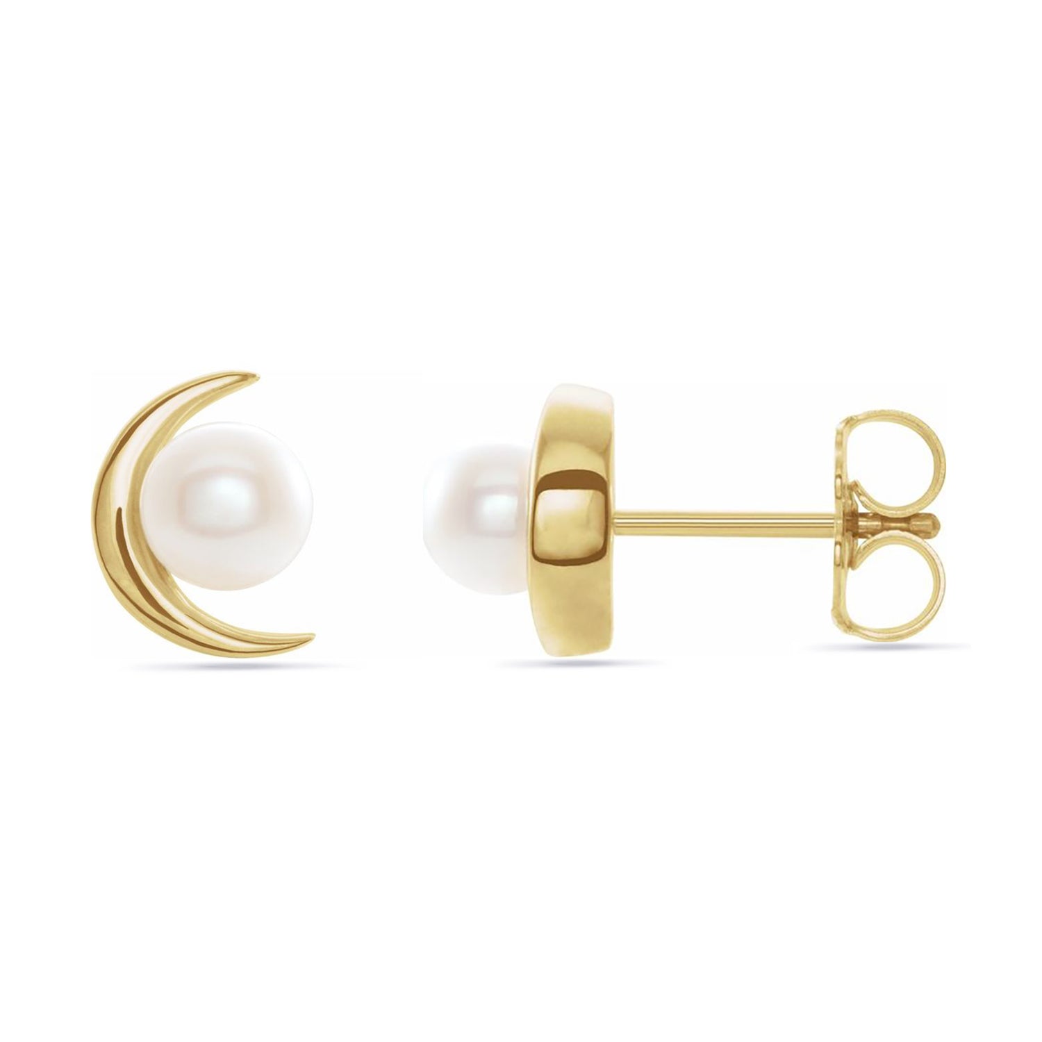 14K Solid Gold Crescent Moon Stud Earrings With Pearl Accent