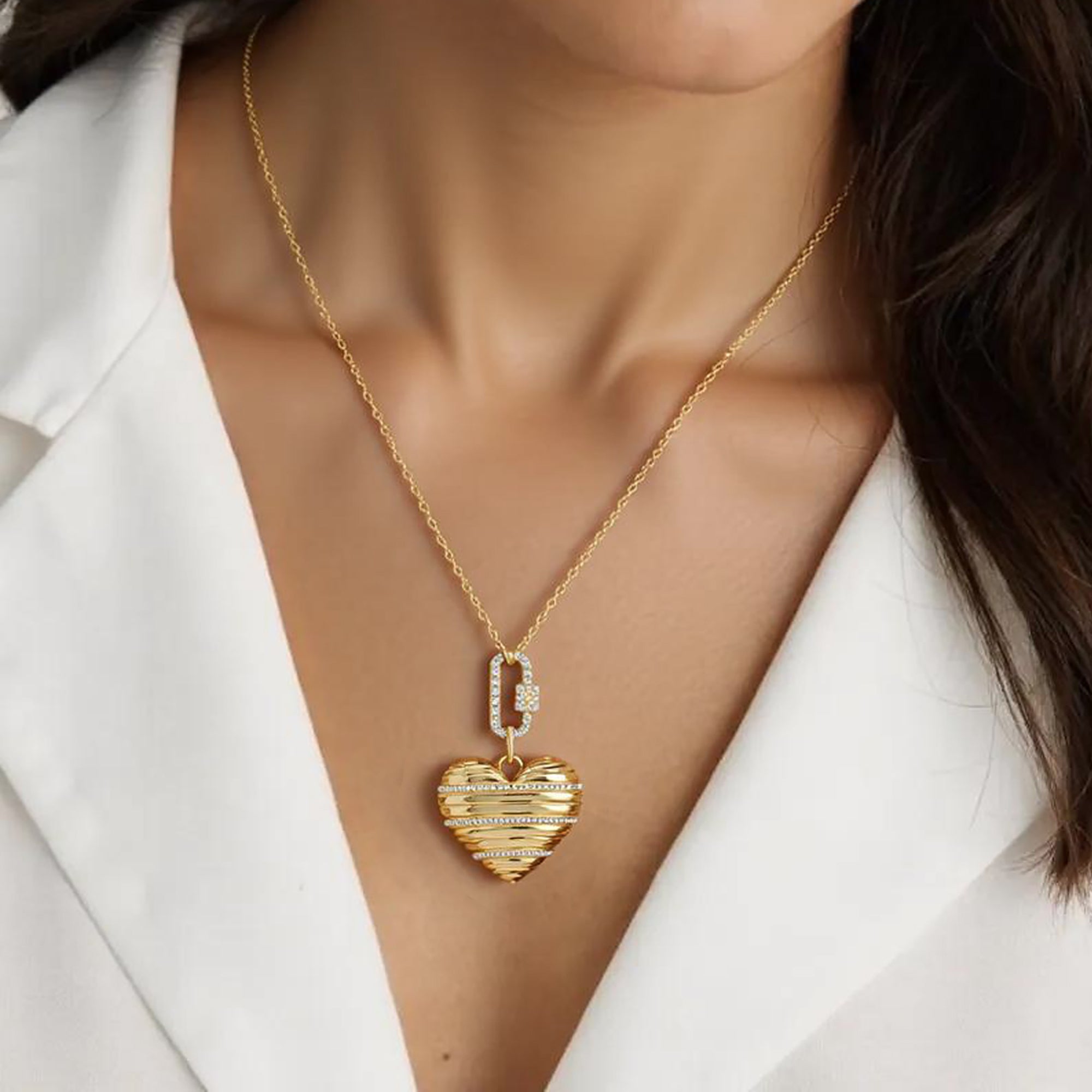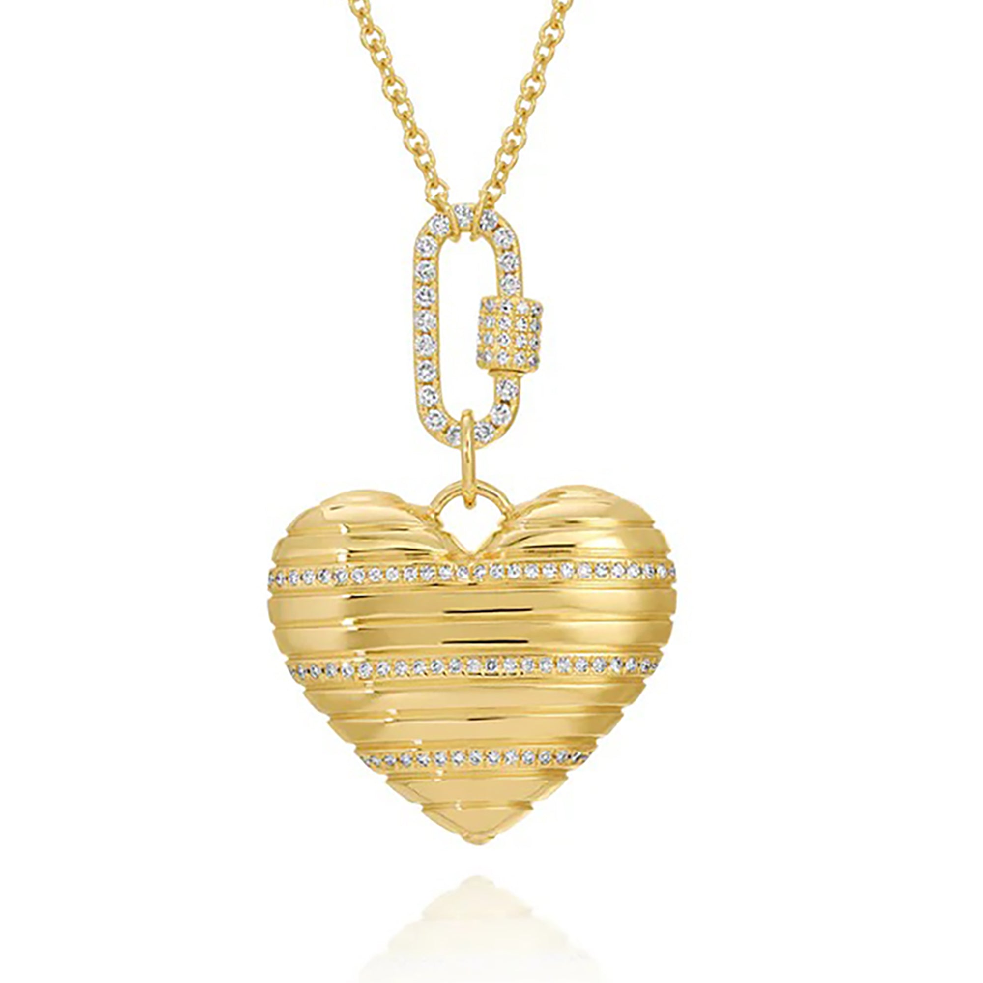 14K Gold Diamond Puffy Heart Charm Pendant Necklace with Diamond Clasp