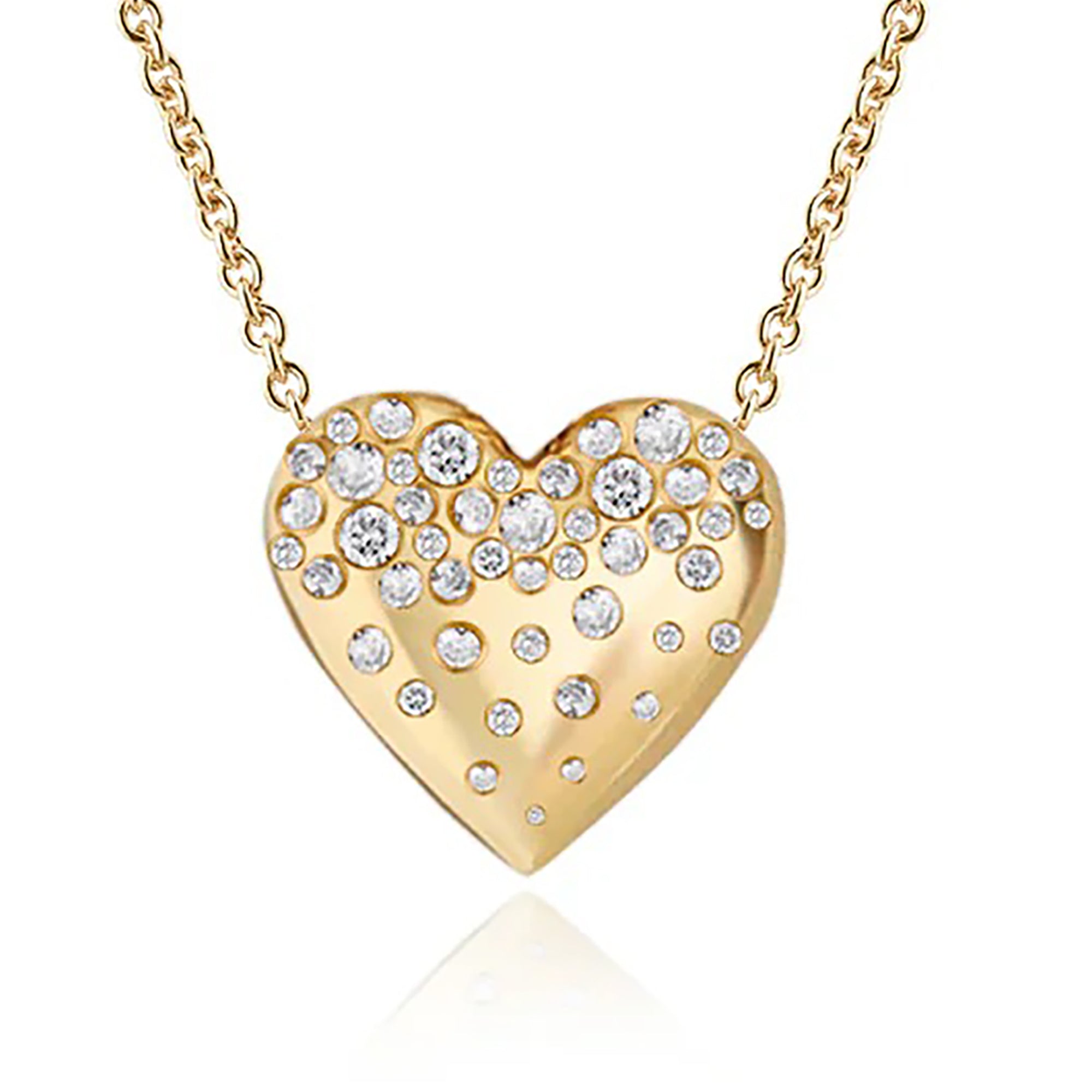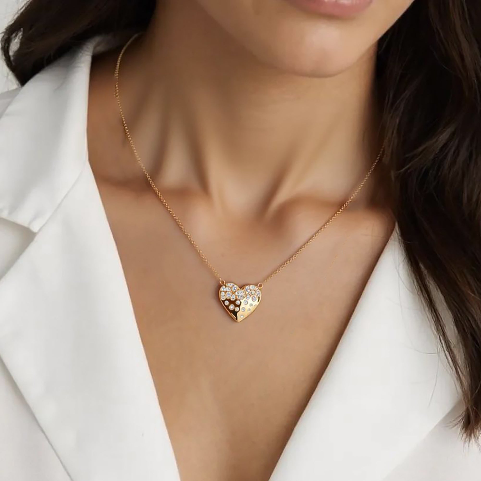 14K Gold Scattered Diamond Puffy Heart Charm Pendant Necklace