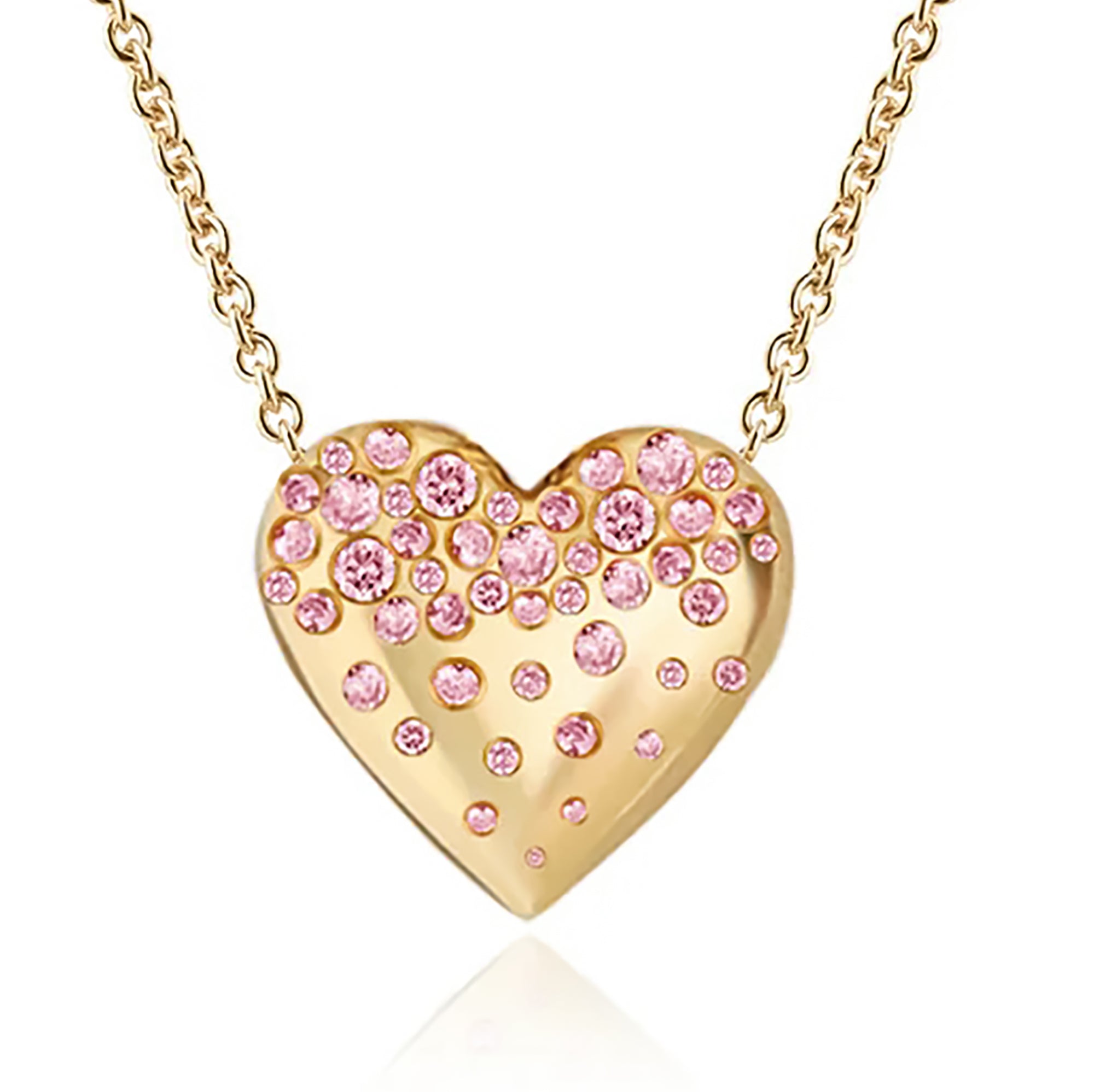 14K Gold Scattered Pink Sapphire Puffy Heart Charm Pendant Necklace