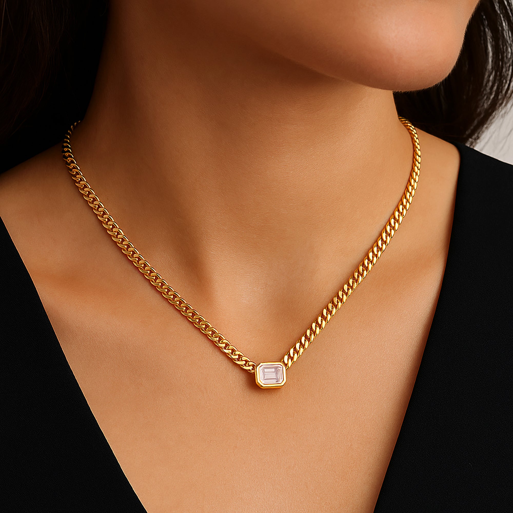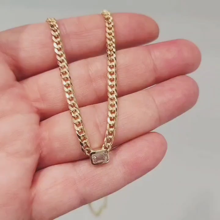 14k Gold Cuban Link Chain Necklace with Bezel Setting Emerald Cut Diamond