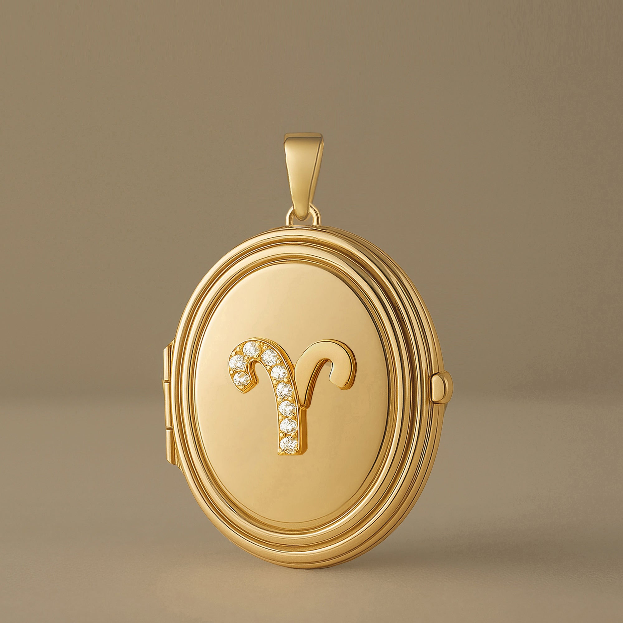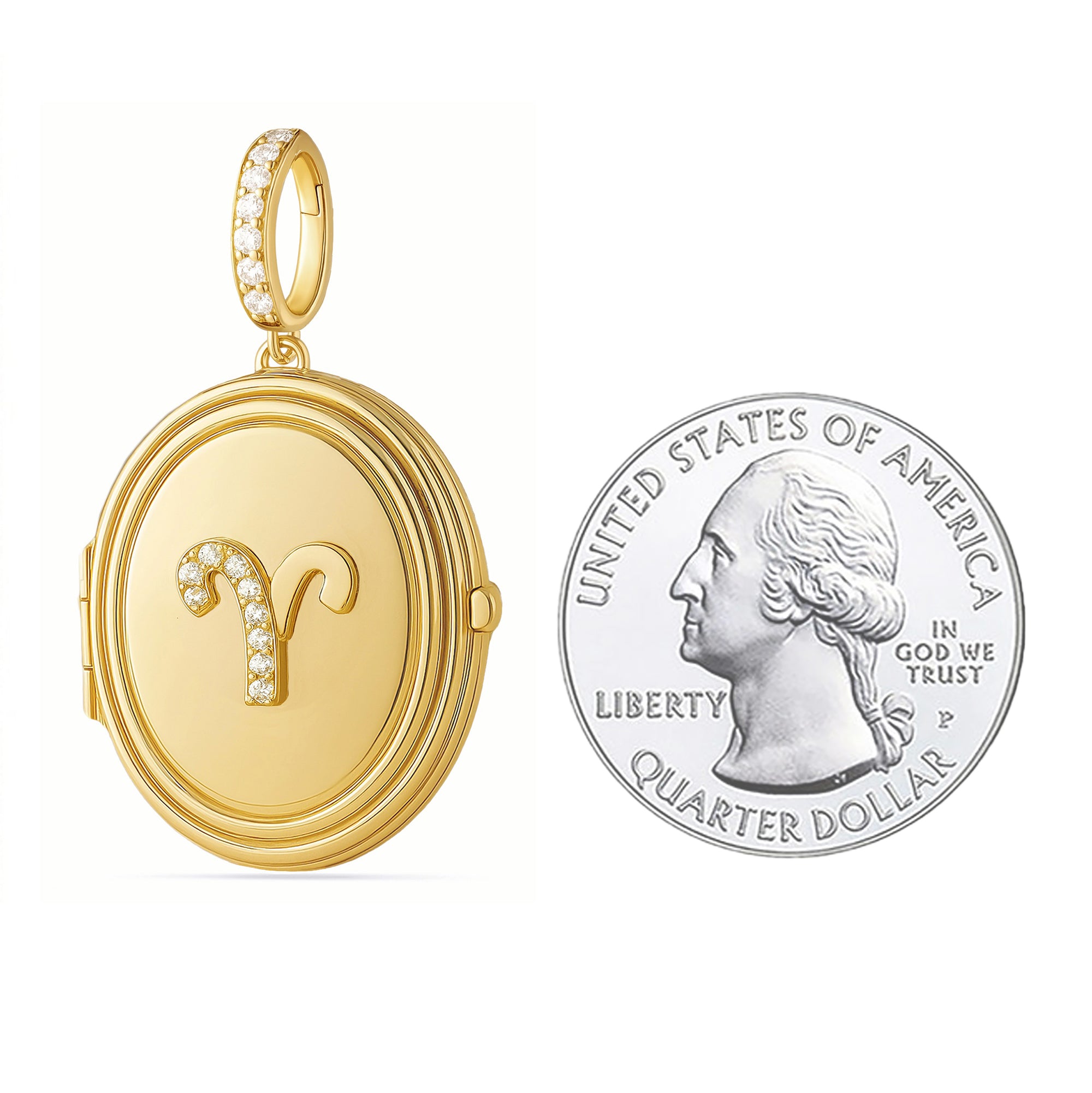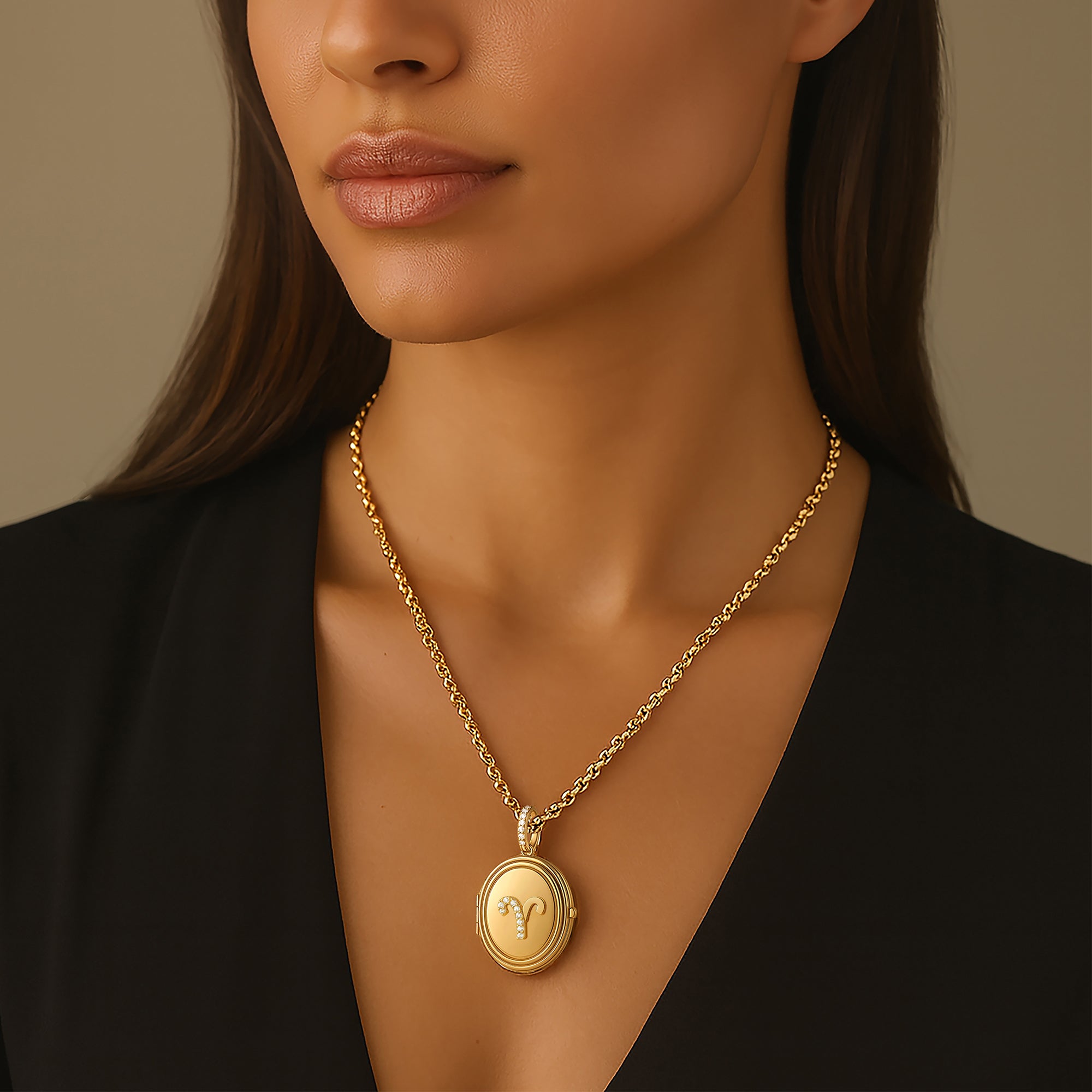 his exquisite 14K solid gold oval zodiac locket is a timeless symbol of individuality and elegance. Handcrafted to order, it features a raised zodiac symbol adorned with natural diamonds, adding celestial sparkle to its polished gold face.