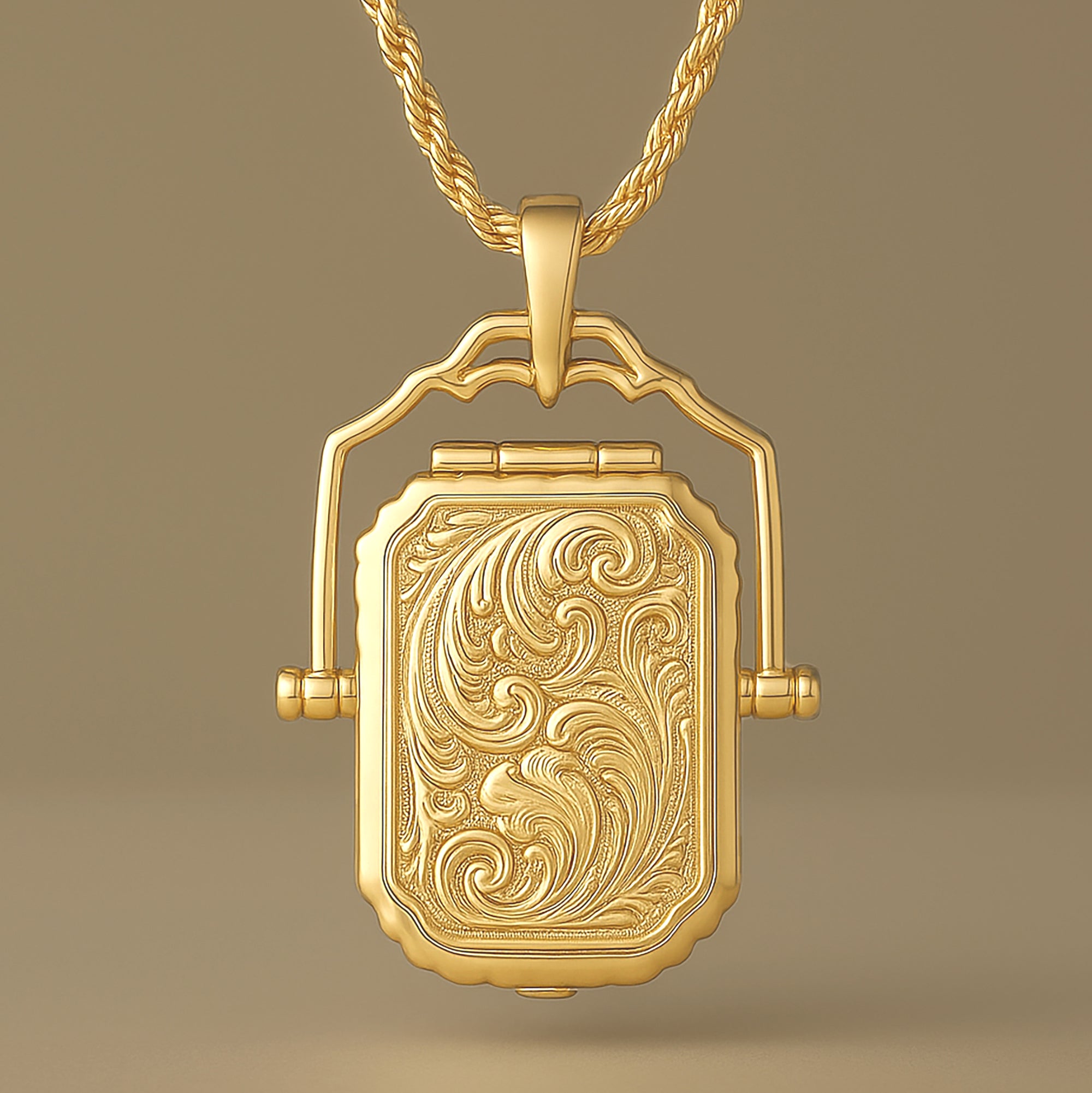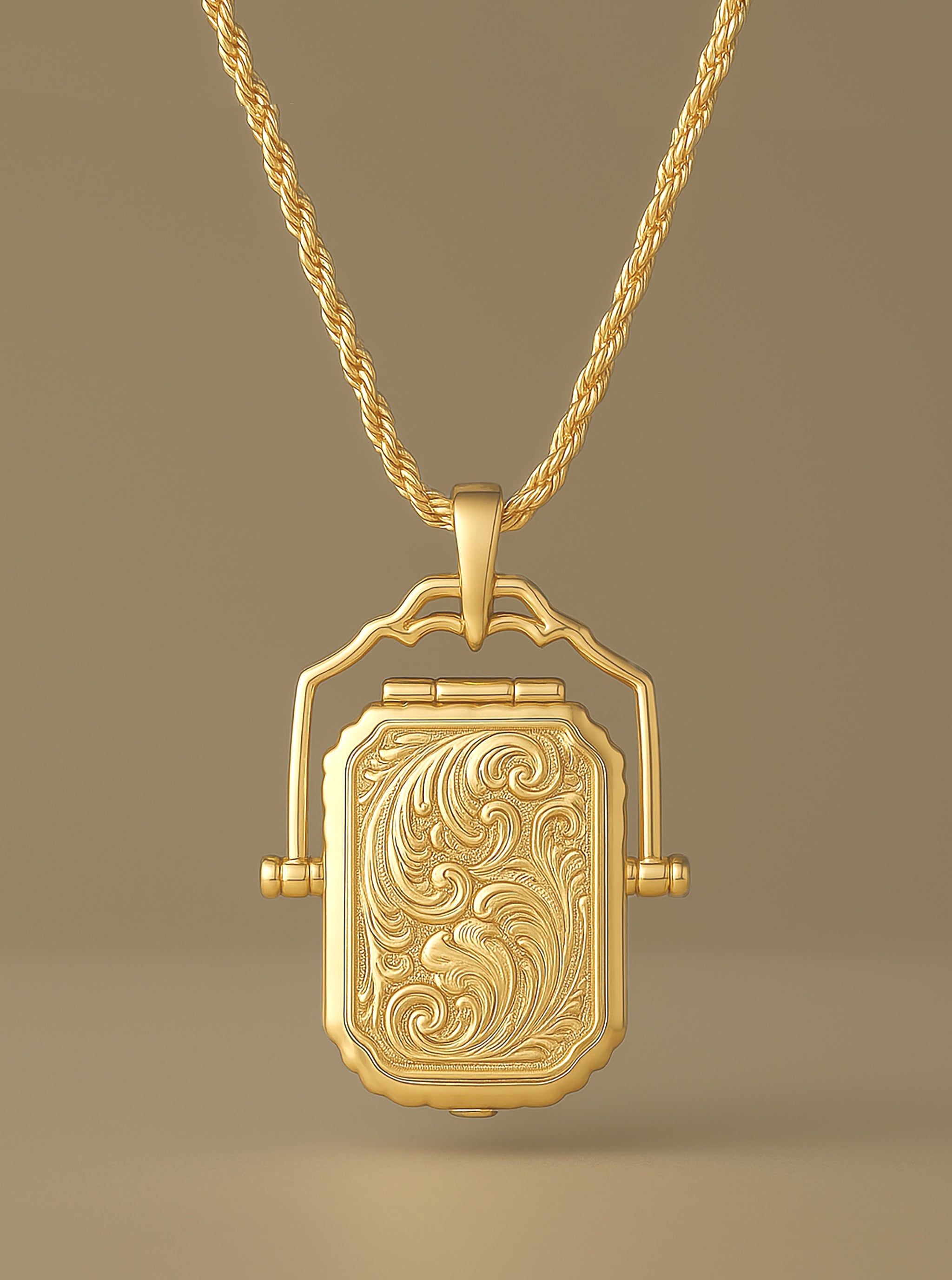 Capture timeless elegance with this 14K Solid Gold Locket Necklace, designed with a luxurious 2mm rope chain and a large filigree swivel locket. Crafted in solid 14K gold, this vintage-inspired piece showcases intricate scrollwork detailing that echoes antique heirlooms. The swivel design allows the locket to gently turn, adding a unique touch of movement and charm.