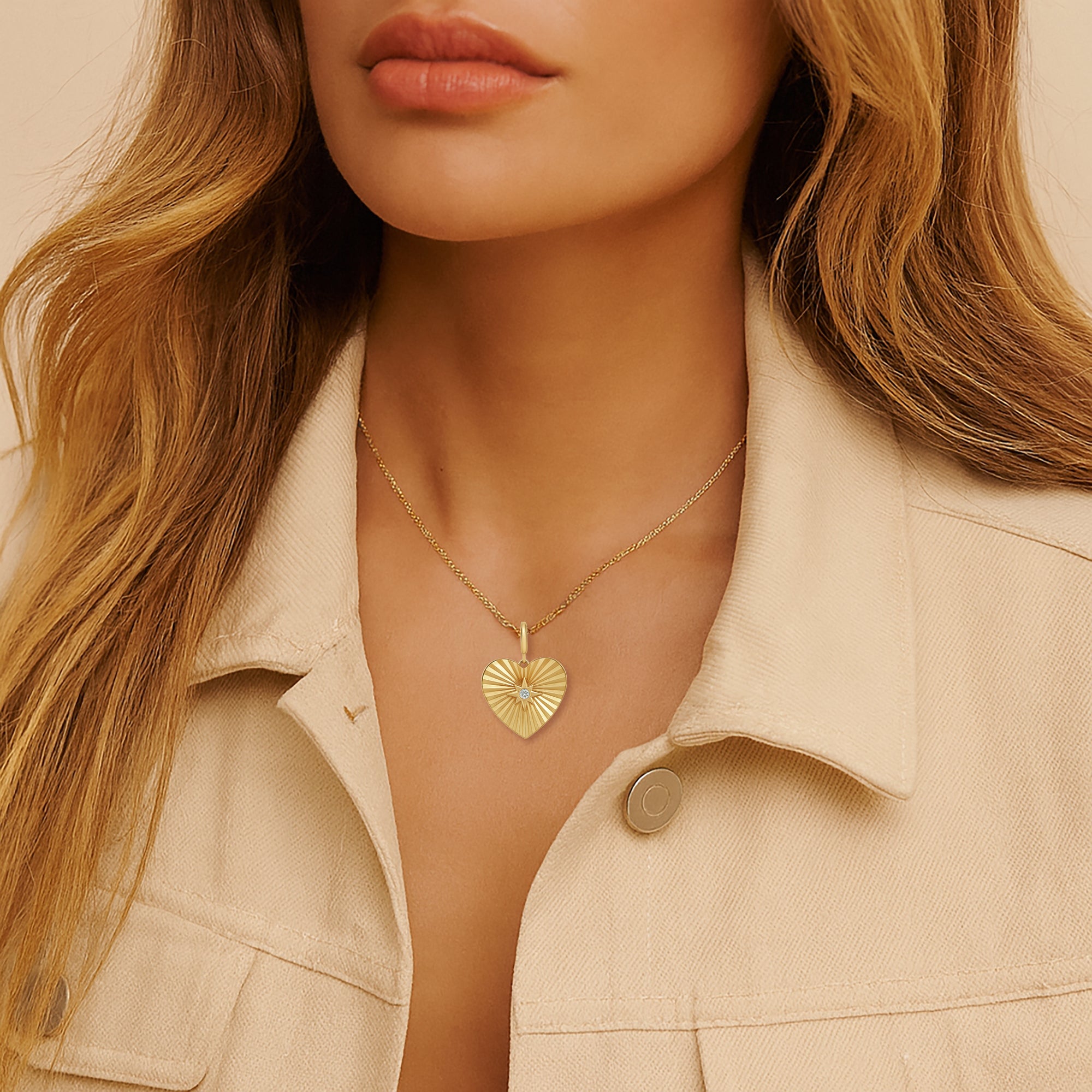 Celebrate love and light with this 14K solid gold fluted heart necklace, accented with a brilliant North Star design set with AAA premium cubic zirconia. The radiant, sunburst-inspired texture reflects light from every angle, symbolizing guidance, hope, and enduring love.