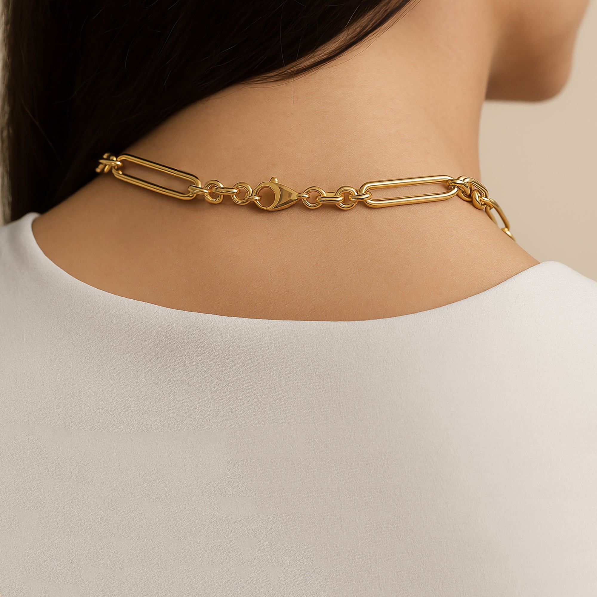 This 14K solid gold necklace blends elongated paperclip links with rounded rolo connectors for a sleek, dimensional look that catches the light from every angle. The mixed-link design sits comfortably at the collarbone, drapes beautifully, and feels substantial without being heavy. Each link is precision-finished to a high polish so the gold shines bright in photos and in person, making it an effortless statement worn solo or layered with your favorite pieces.Ā