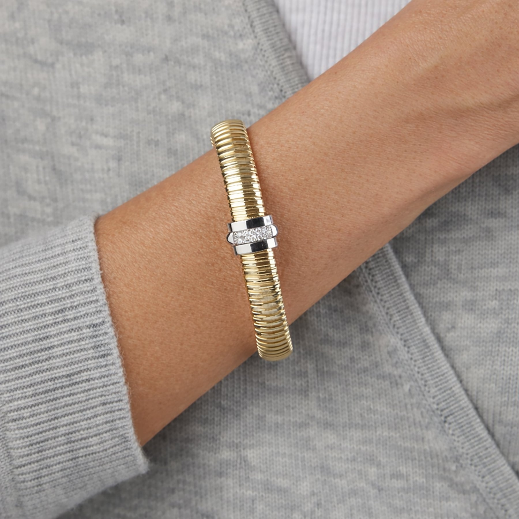 Crafted in solid 14K yellow gold, this elegant Tubogas bracelet features a flexible coil bangle design that wraps comfortably around the wrist with effortless sophistication. Accented with brilliant diamond stations, the ribbed Tubogas construction offers exceptional flexibility, durability, and a sleek high-polish finish. A timeless statement piece inspired by Italian craftsmanship, this diamond Tubogas bangle is perfect for everyday luxury, stacking, or wearing alone as a refined gold bracelet for women.