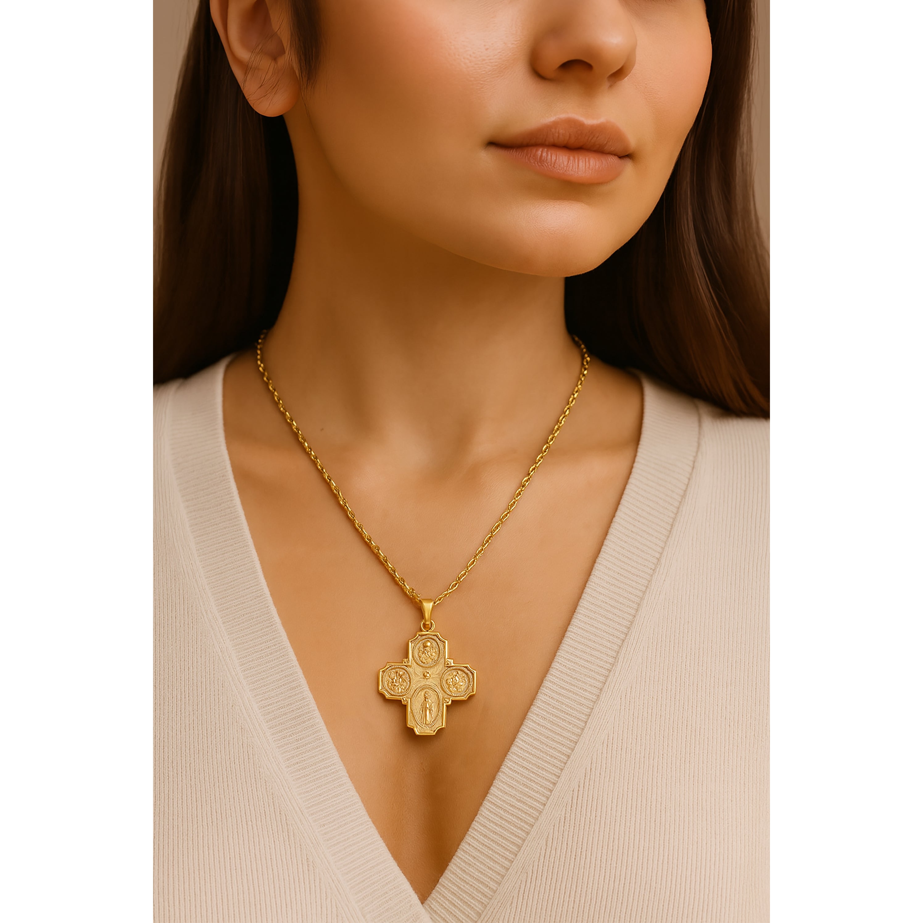 Honor your faith with this 14K Solid Gold Four-Way Cross Pendant, a powerful symbol of devotion, protection, and Catholic tradition. This meaningful design combines four sacred images in one pendant: