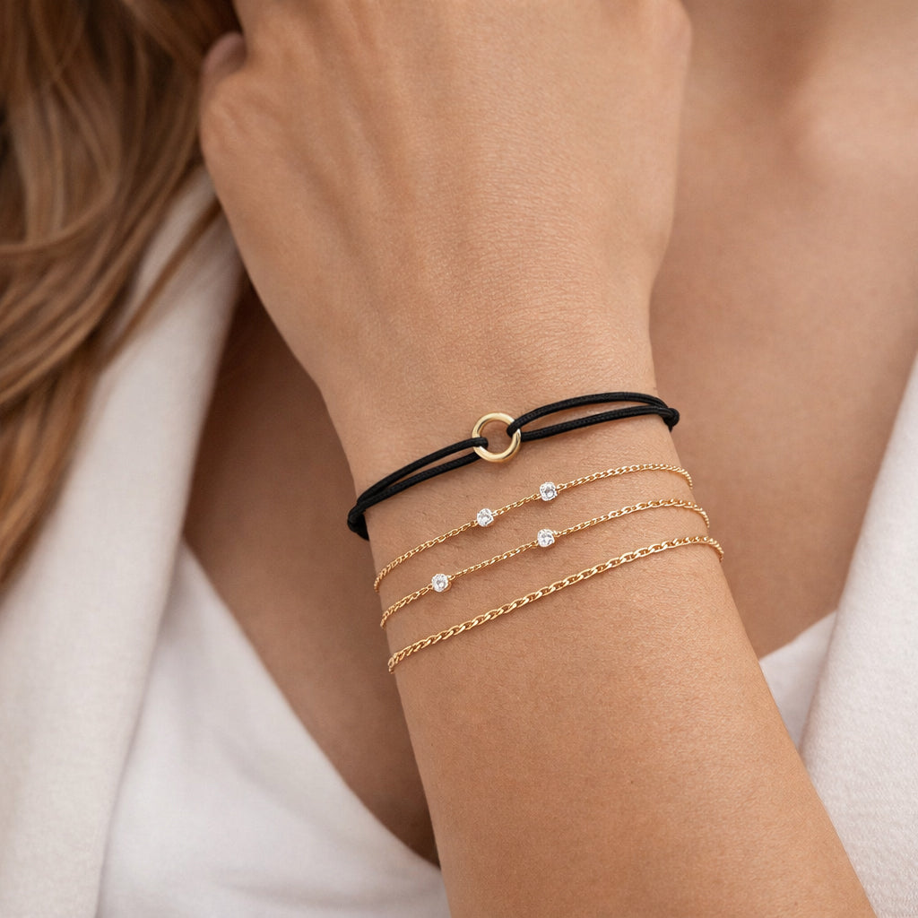 Elegant full-body shot of a model with a slim wrist wearing a subtle 14K gold red cord bracelet with a tiny circle charm, studio setting.