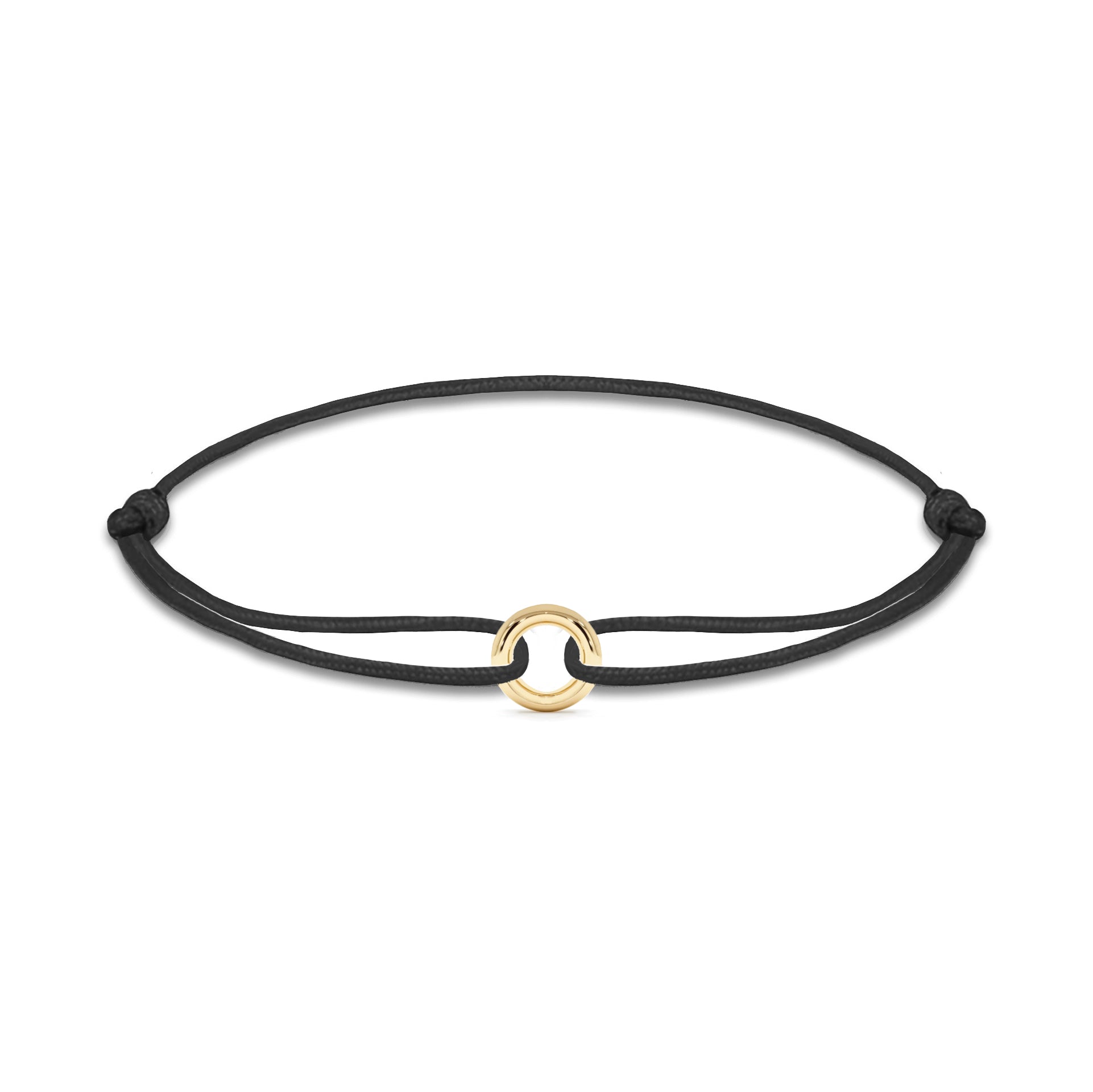 Close-up of a small 7mm gold circle charm on a red cord bracelet, highlighting the micro-texture and luxury of 14K solid gold.