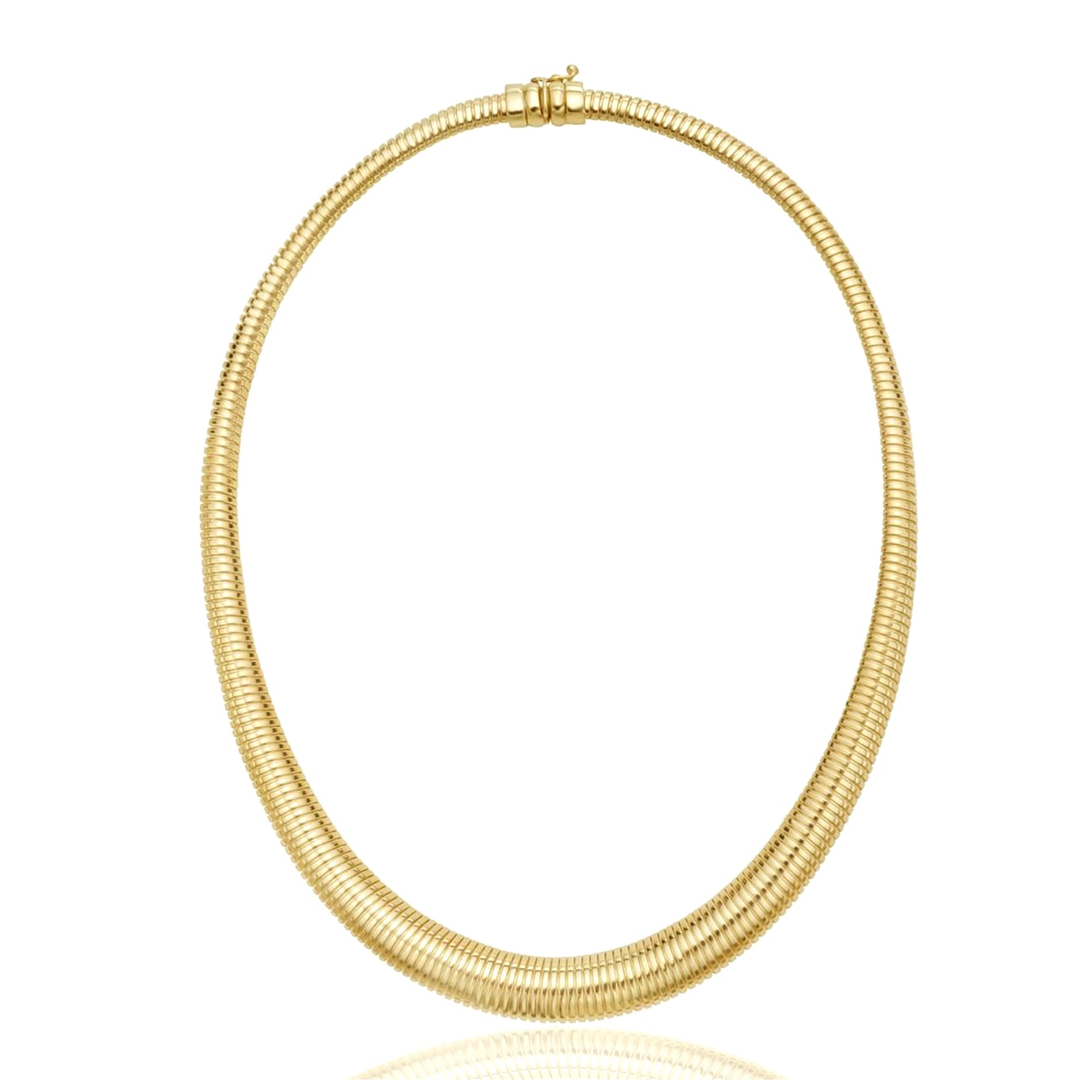Crafted in solid 14K yellow gold, this elegant graduated Tubogas necklace features a smooth flexible cobra coil design that gradually widens at the center for a bold, sculpted silhouette. Inspired by classic Italian gold craftsmanship, the tubogas construction offers exceptional flexibility, comfort, and durability.