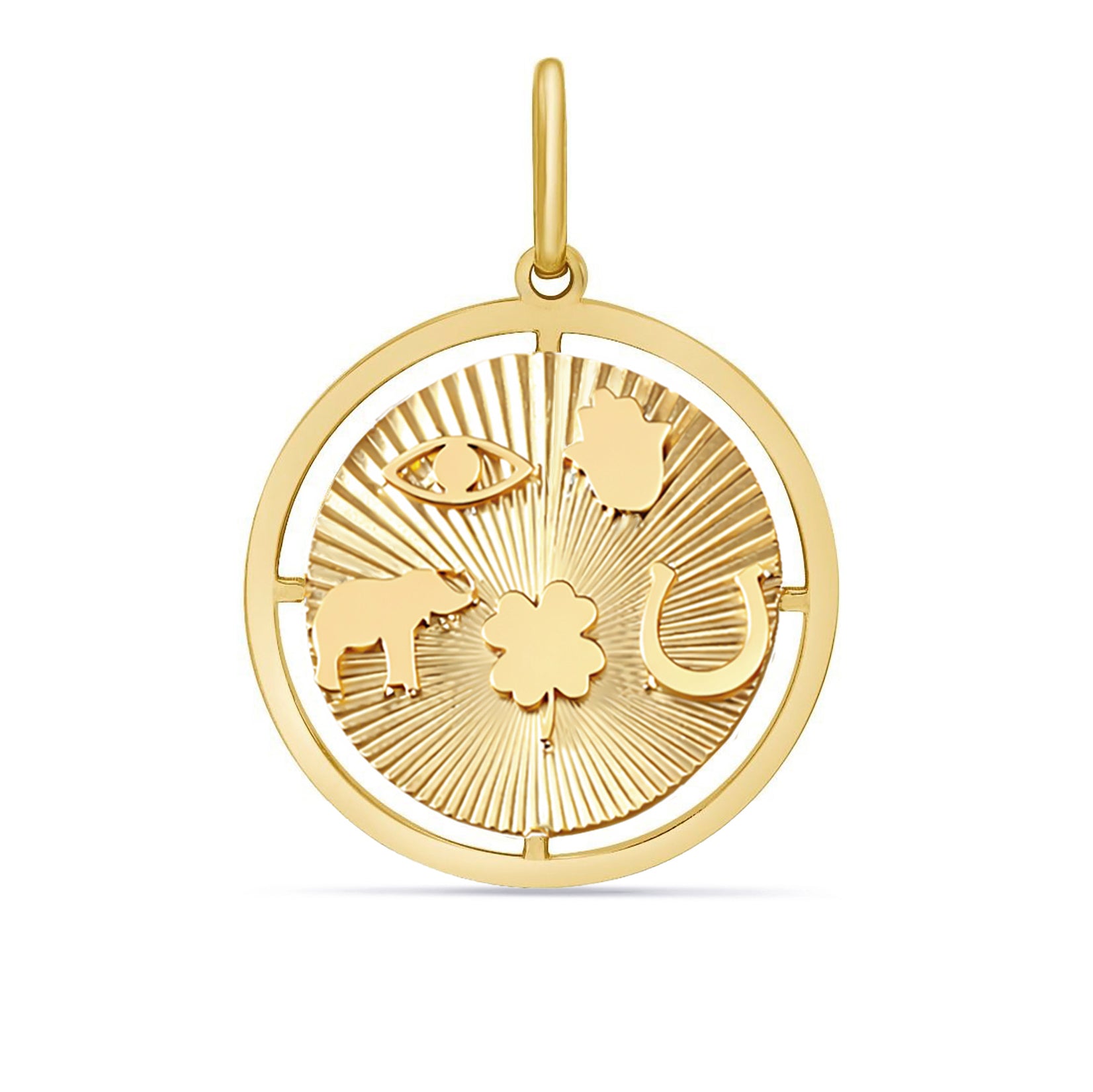 14K Gold Fluted Good Luck Hamsa Evil Eye Medallion Pendant