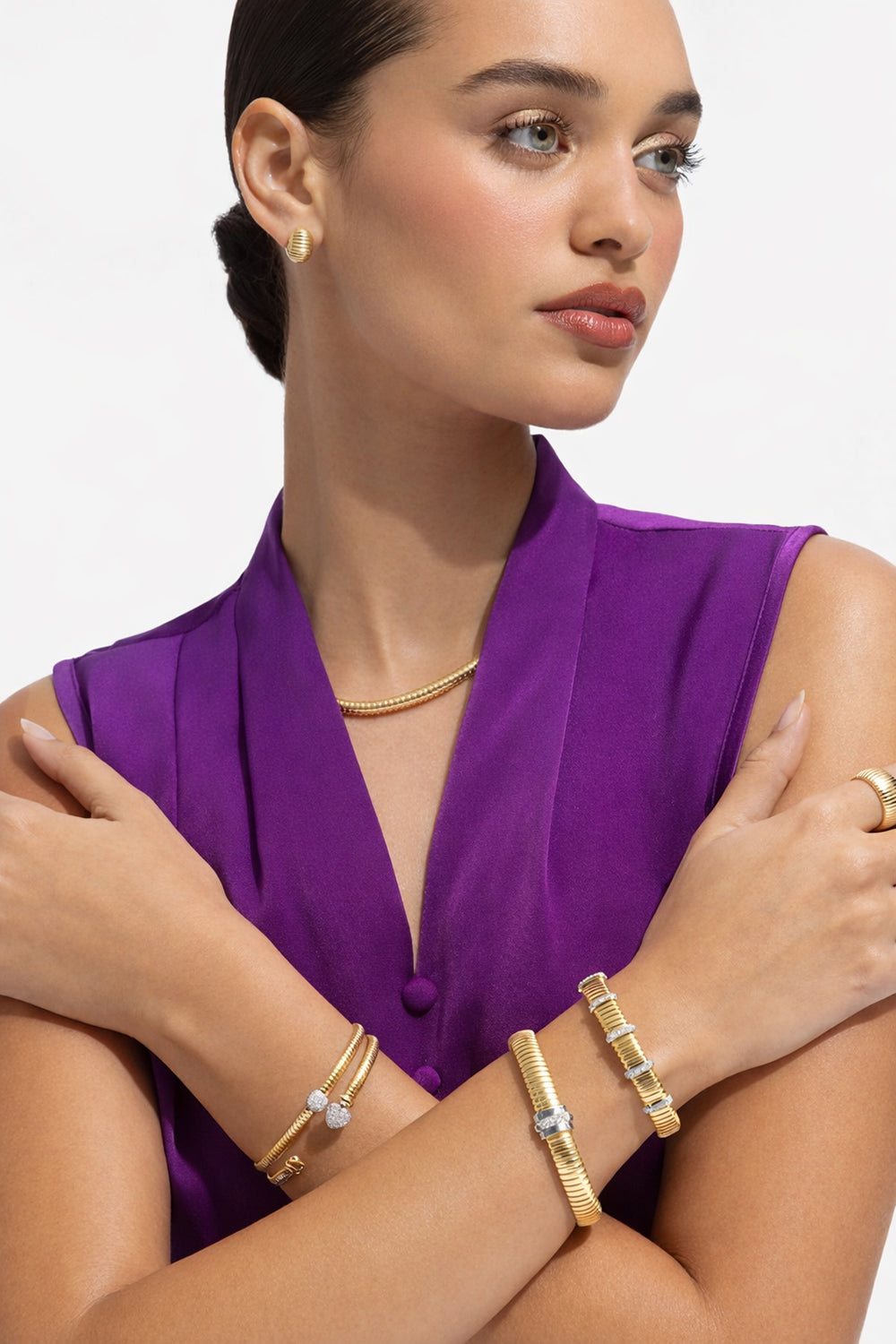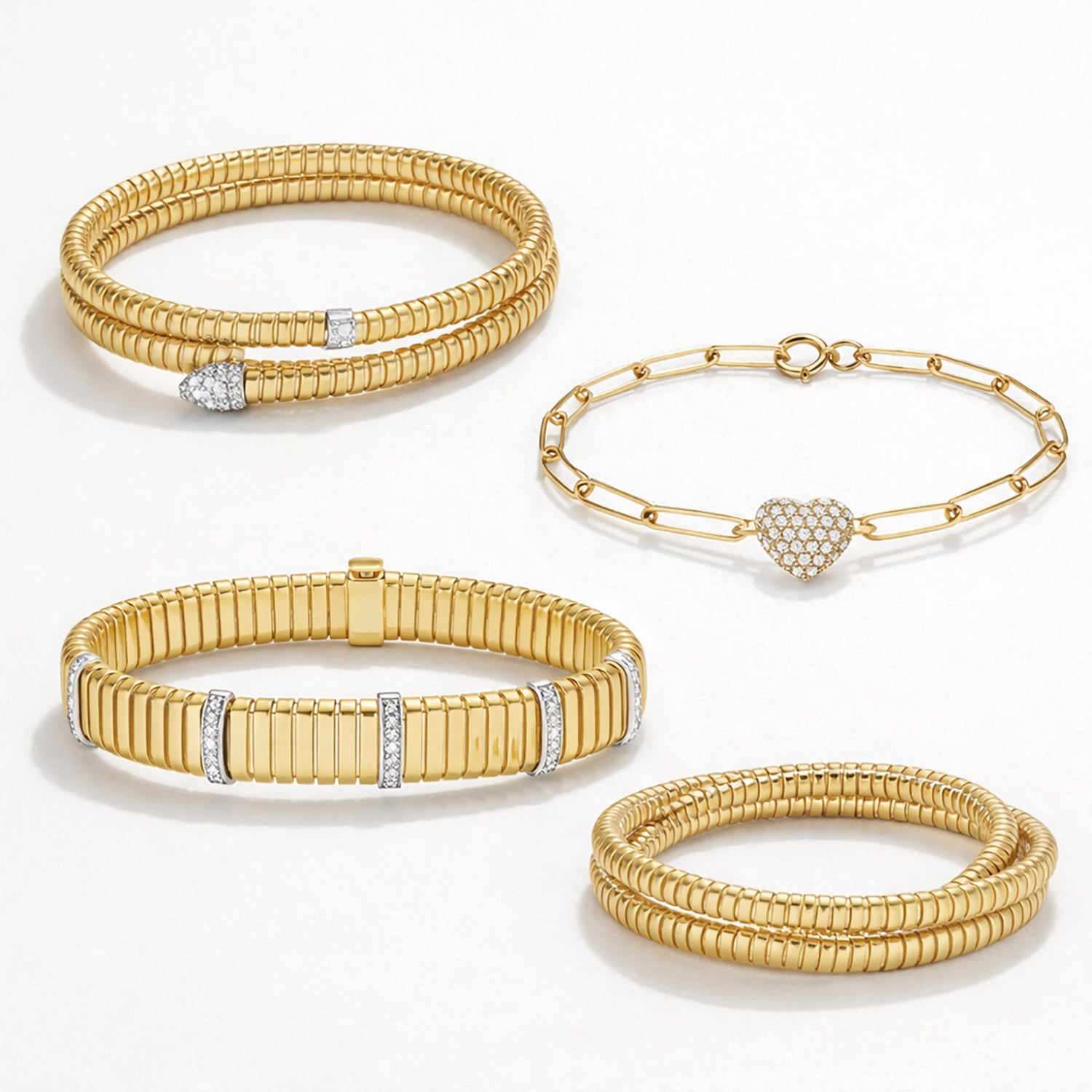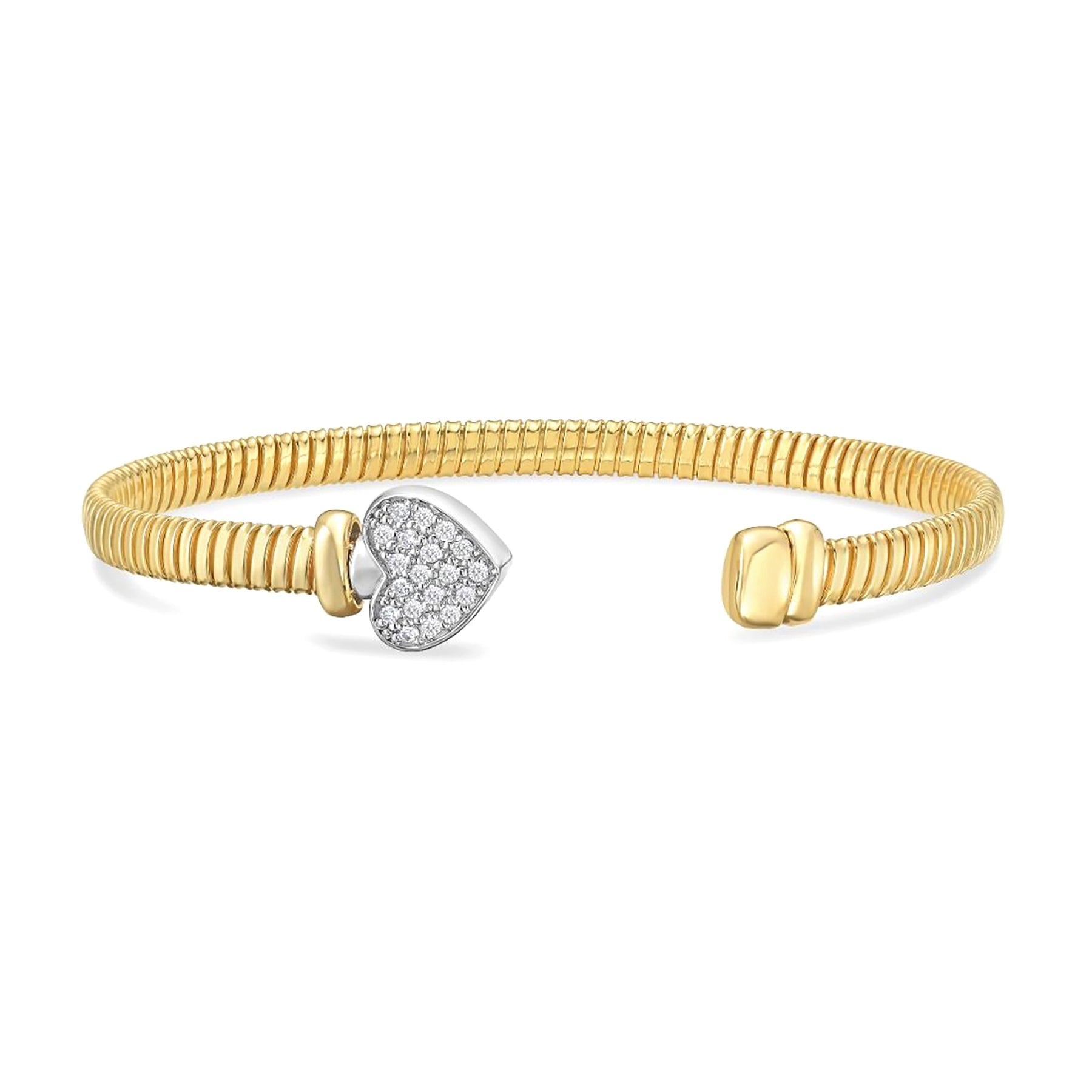 14K Solid Gold Diamond Heart Tubogas Bracelet – Flexible Coil Cuff Bangle