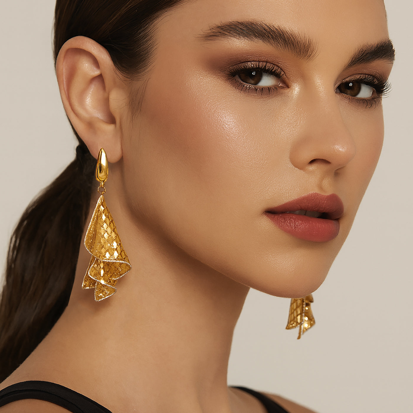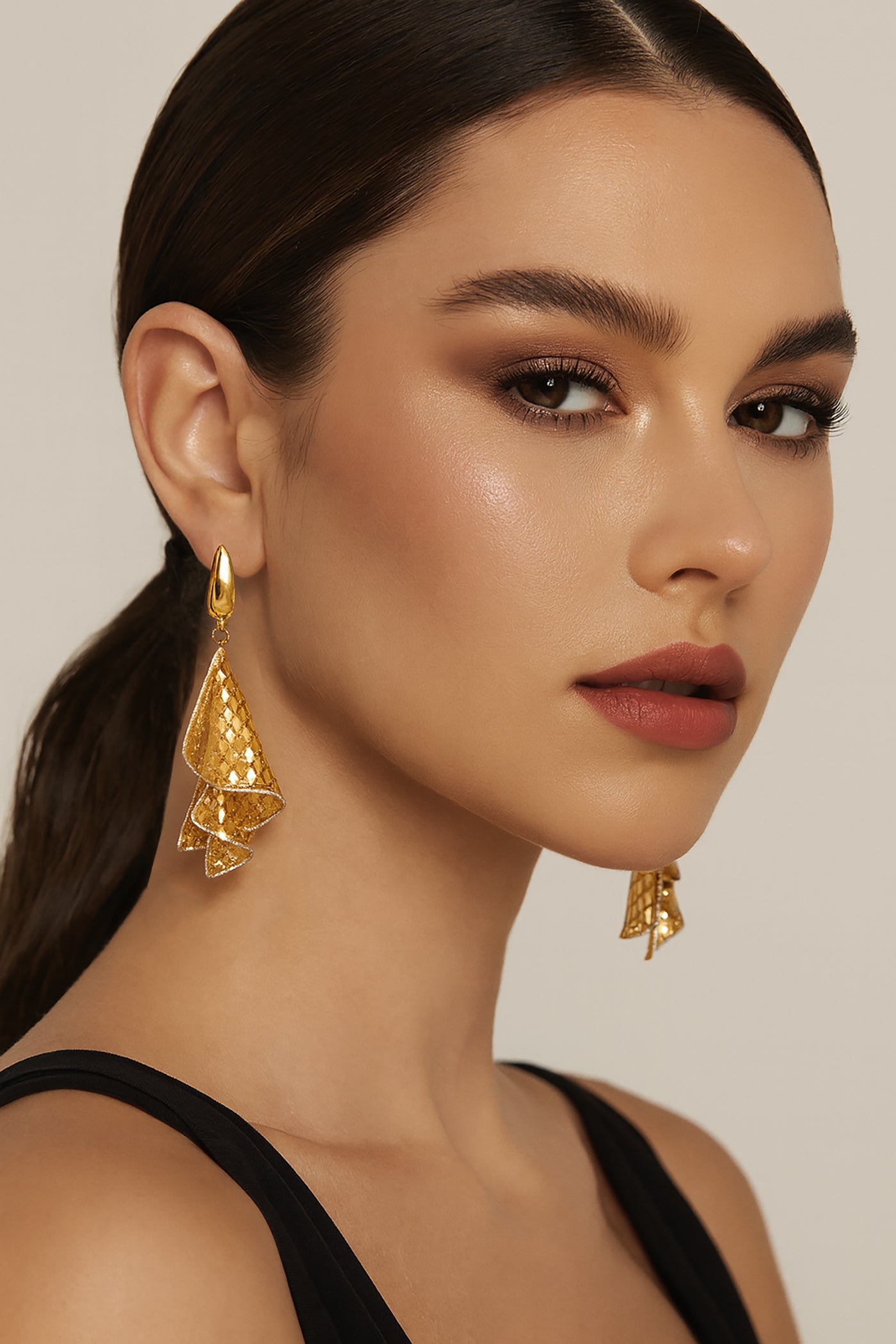 14K Italian Gold Mesh Cloth Drop Earrings – Textured Draped Statement Dangles for Women