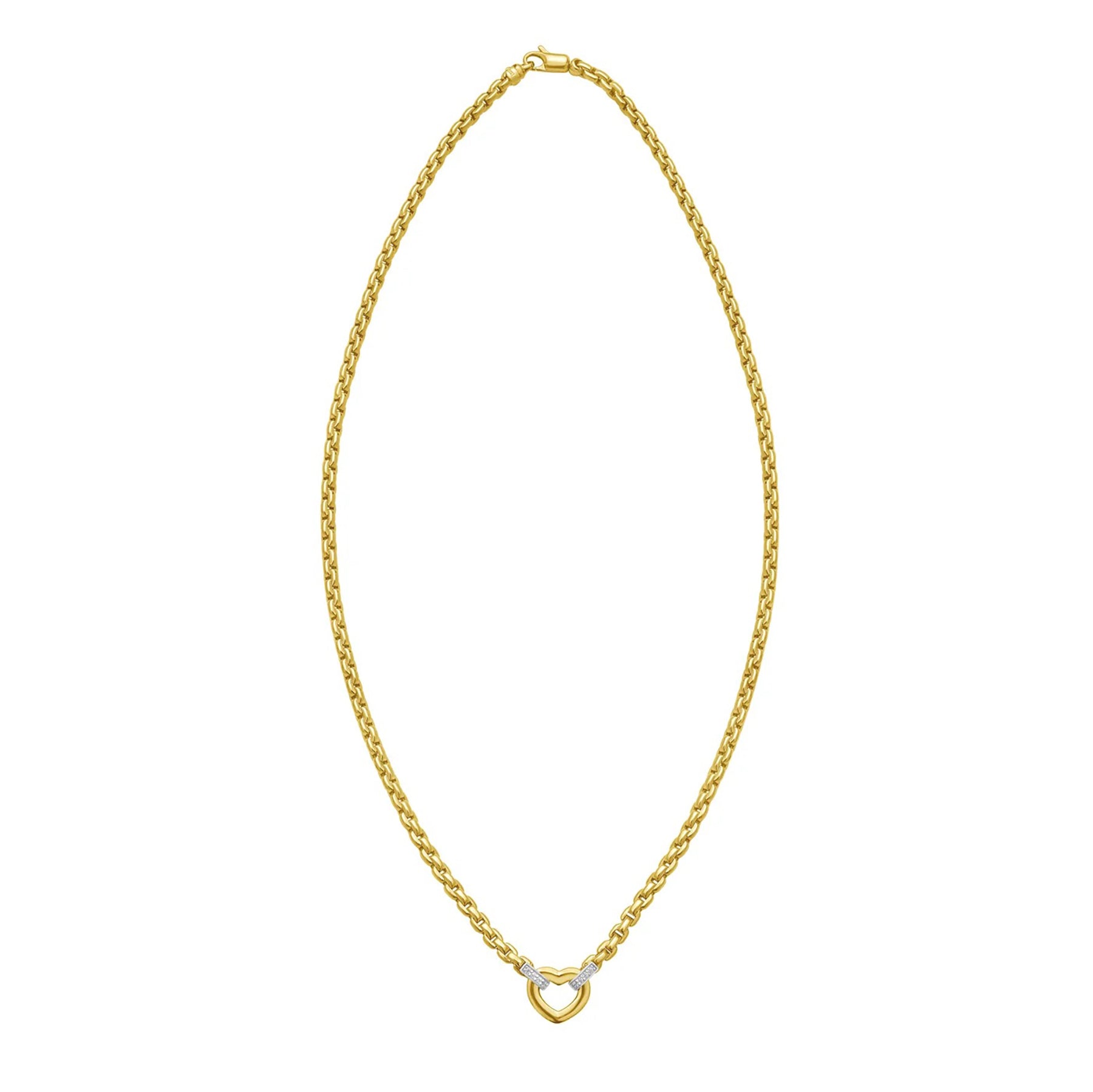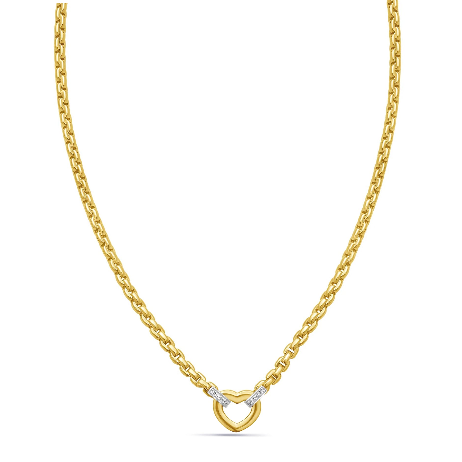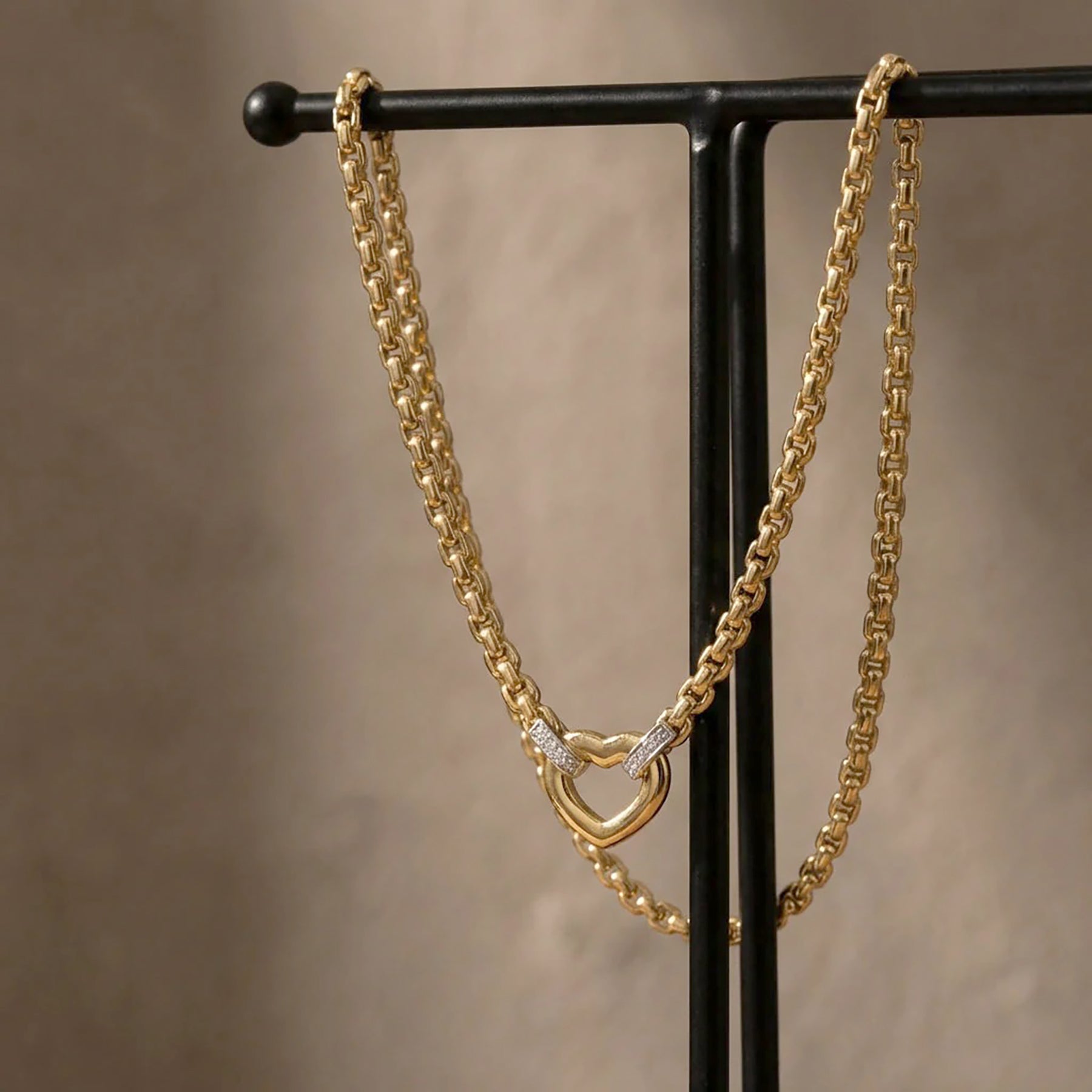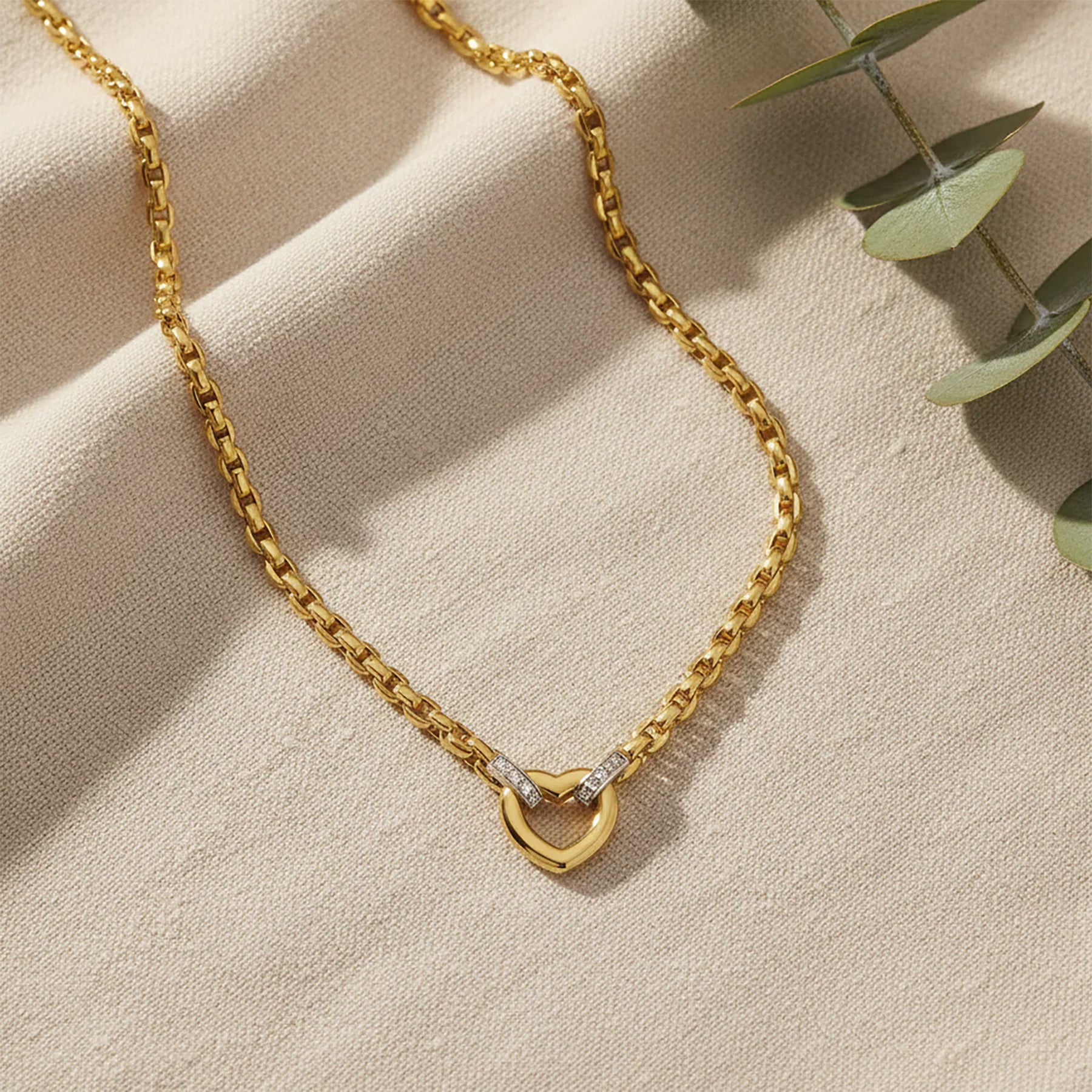 At the center, a beautifully sculpted heart accented with natural diamonds adds subtle brilliance, catching the light with every movement. Designed for everyday elegance or meaningful gifting, this necklace pairs effortlessly with its matching bracelet for a complete, luxurious set.