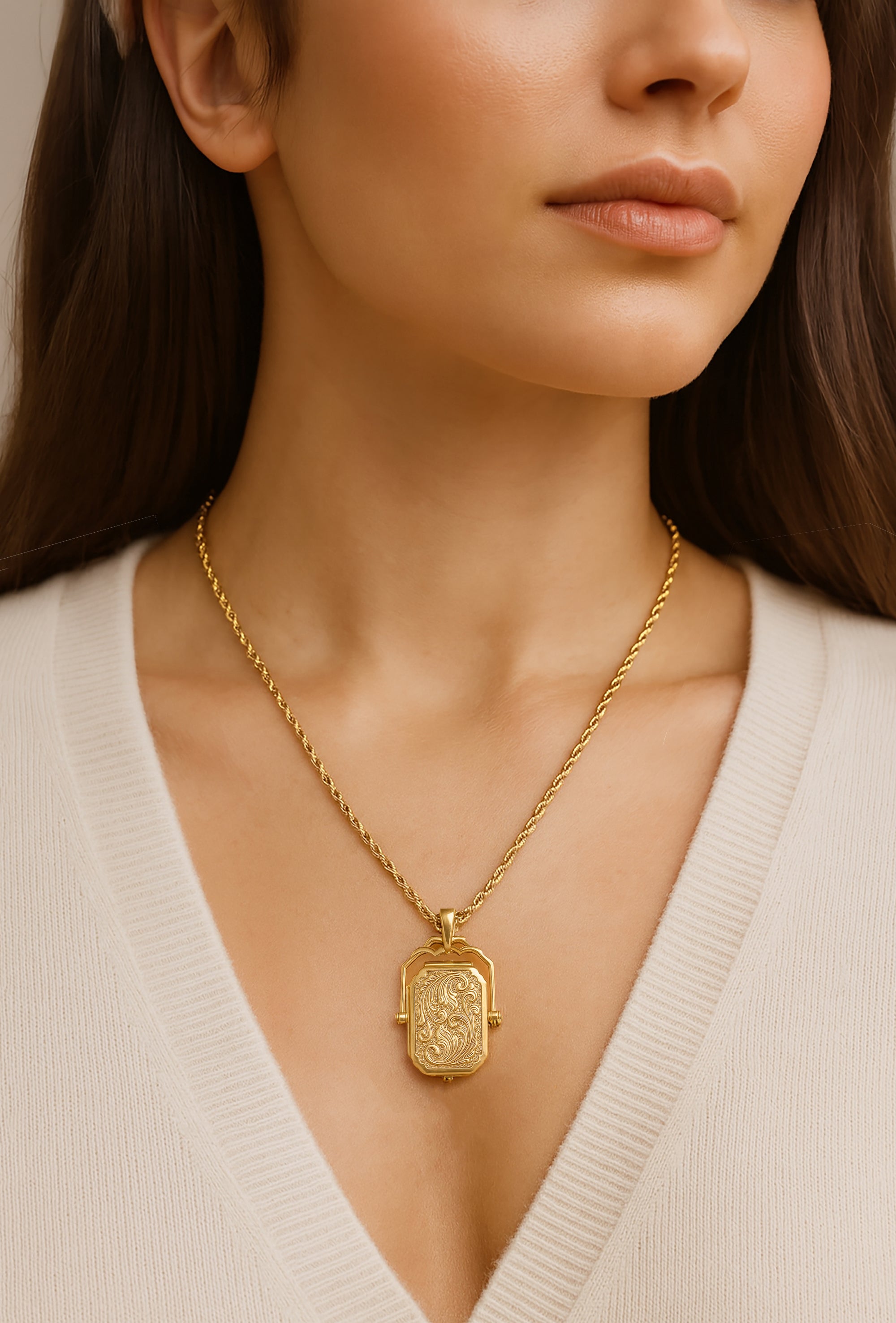 Capture timeless elegance with this 14K Solid Gold Locket Necklace, designed with a luxurious 2mm rope chain and a large filigree swivel locket. Crafted in solid 14K gold, this vintage-inspired piece showcases intricate scrollwork detailing that echoes antique heirlooms. The swivel design allows the locket to gently turn, adding a unique touch of movement and charm.