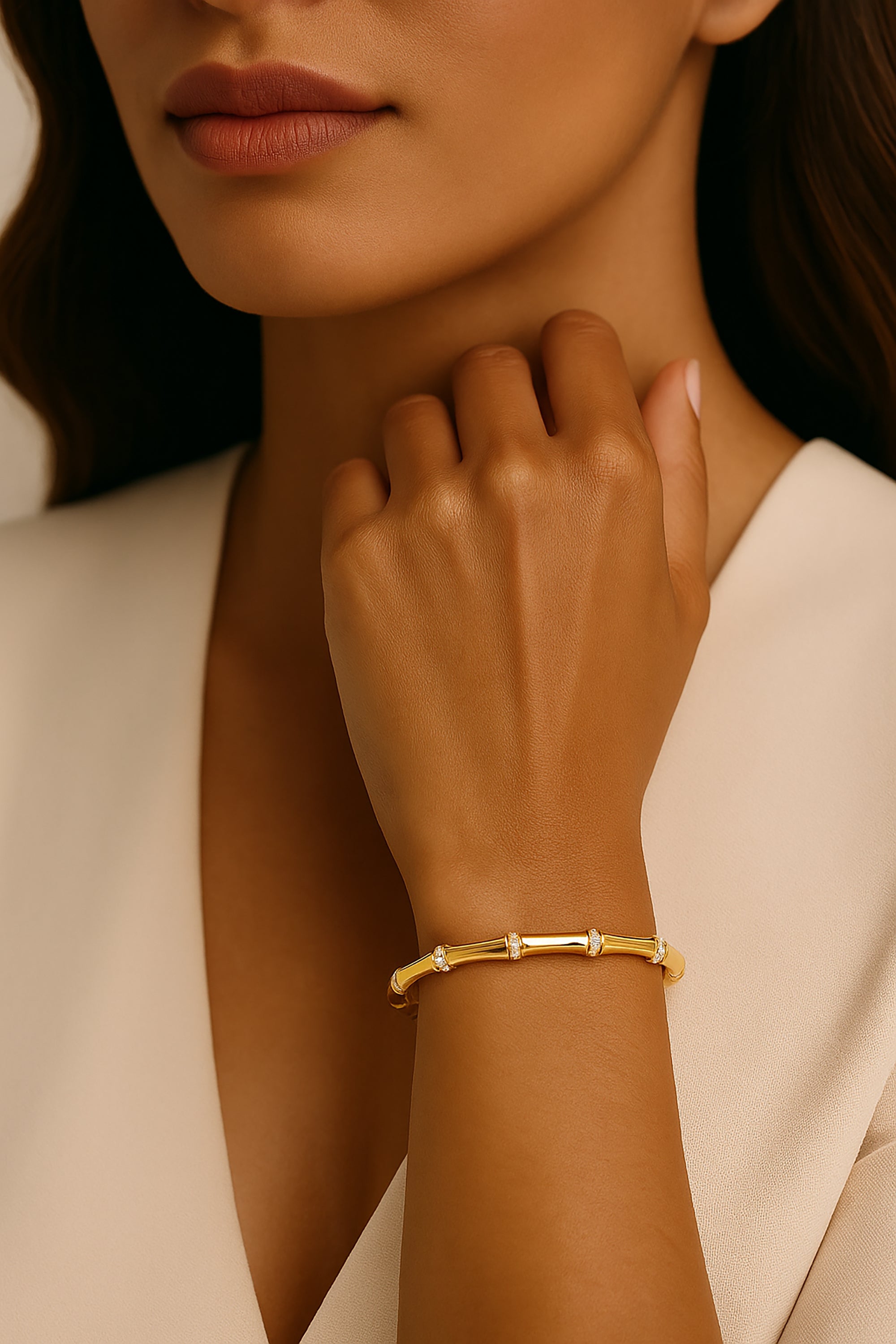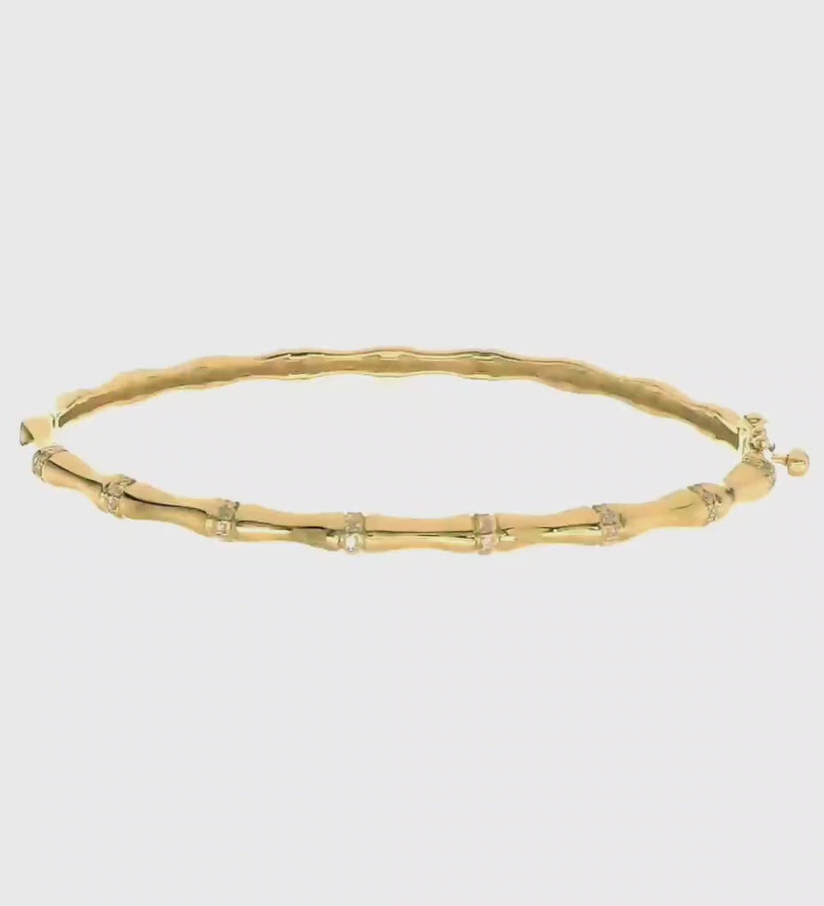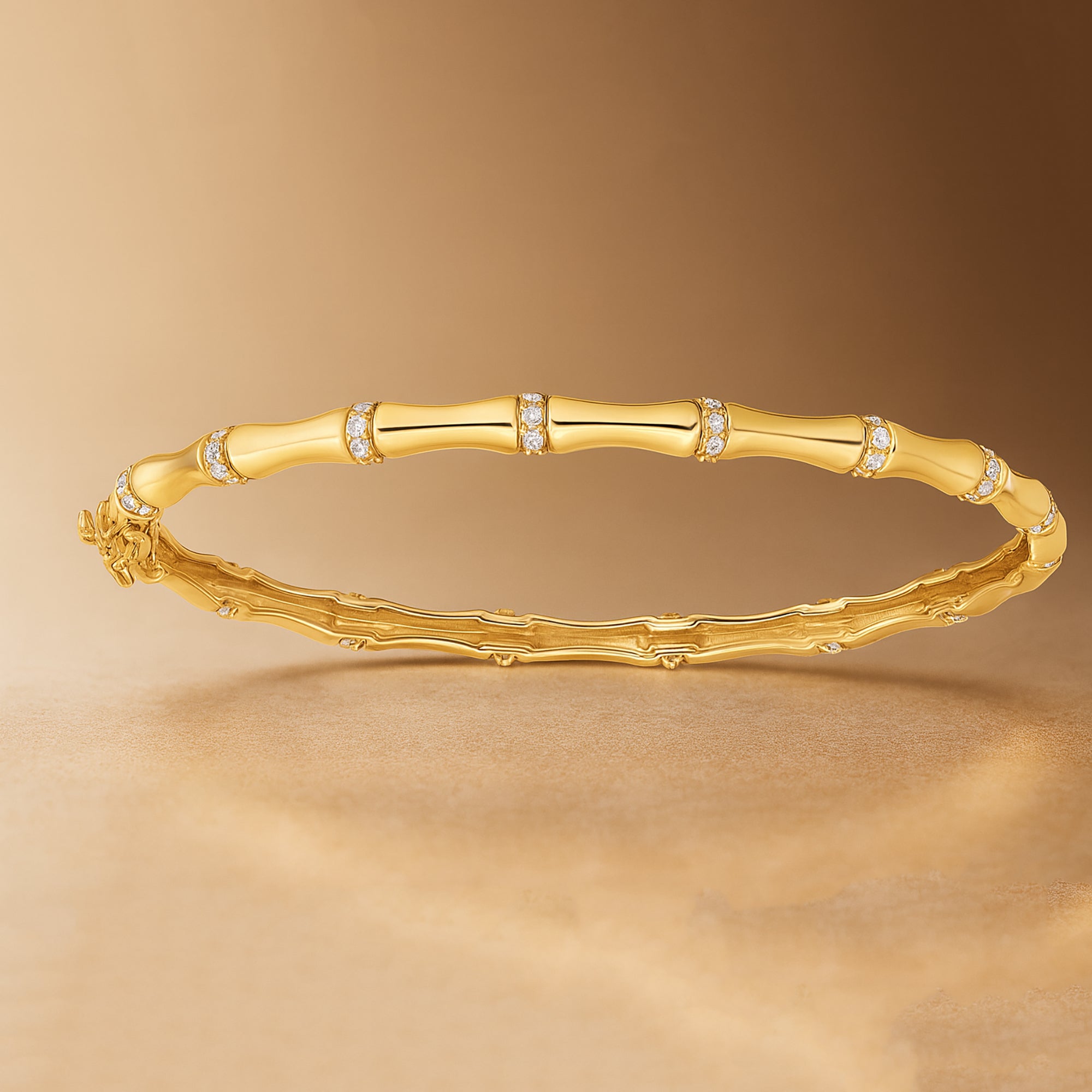 Crafted with precision, the bangle's elegant bamboo motif is accented with dazzling, conflict-free diamonds meticulously set in shimmering 14K solid gold.