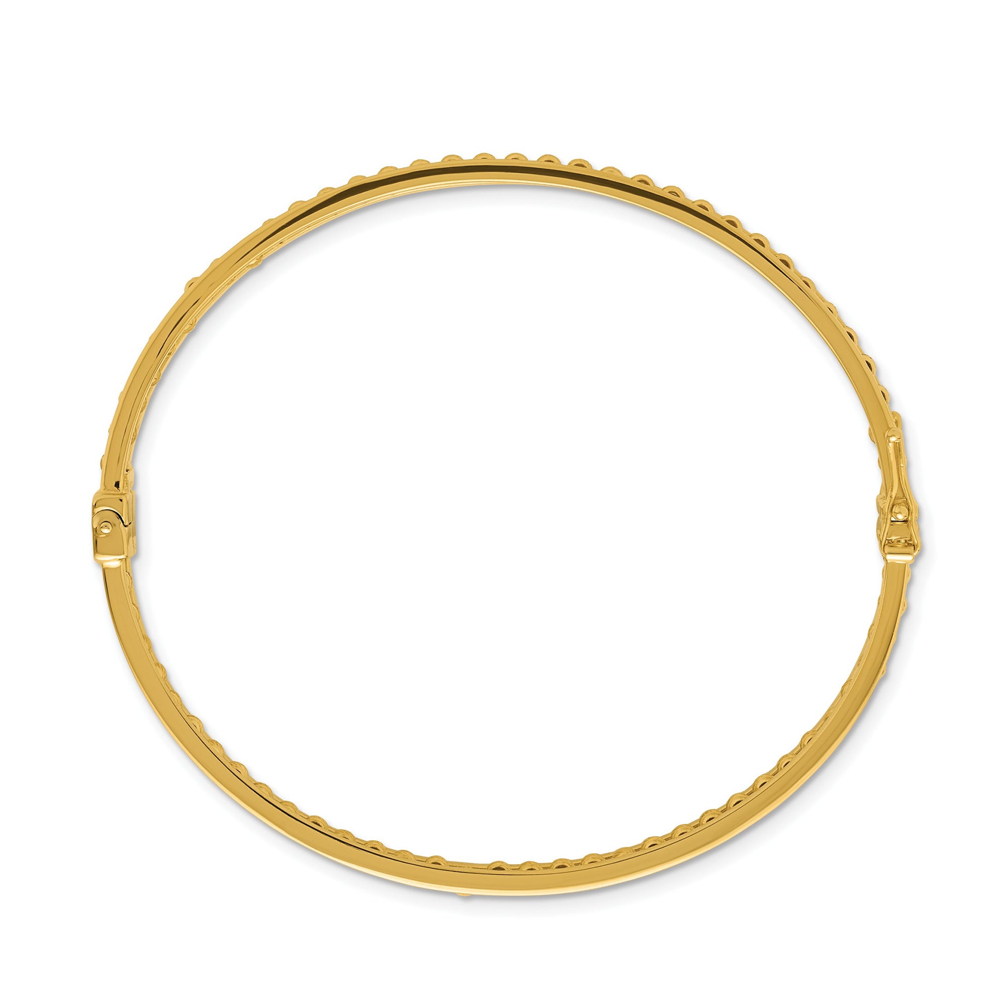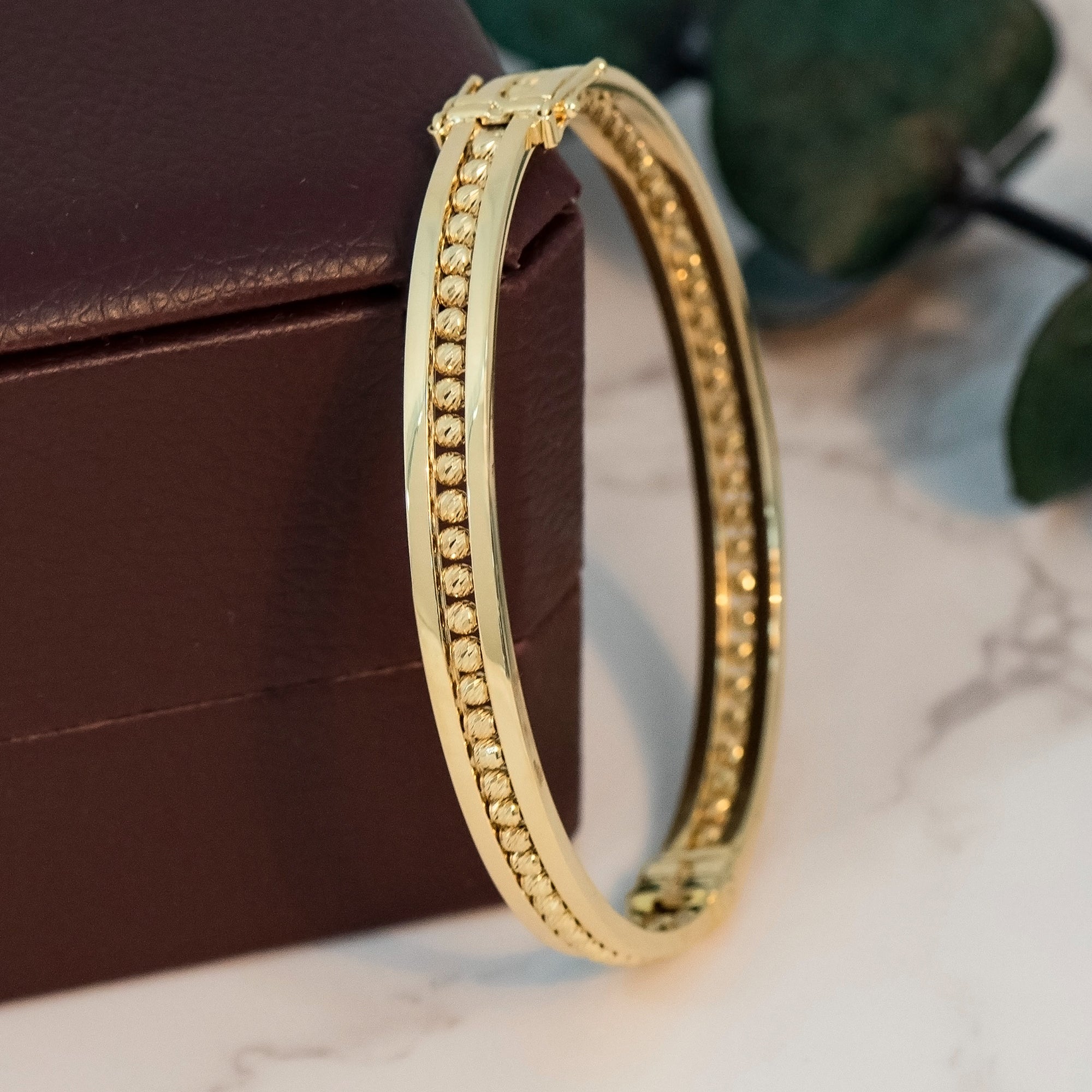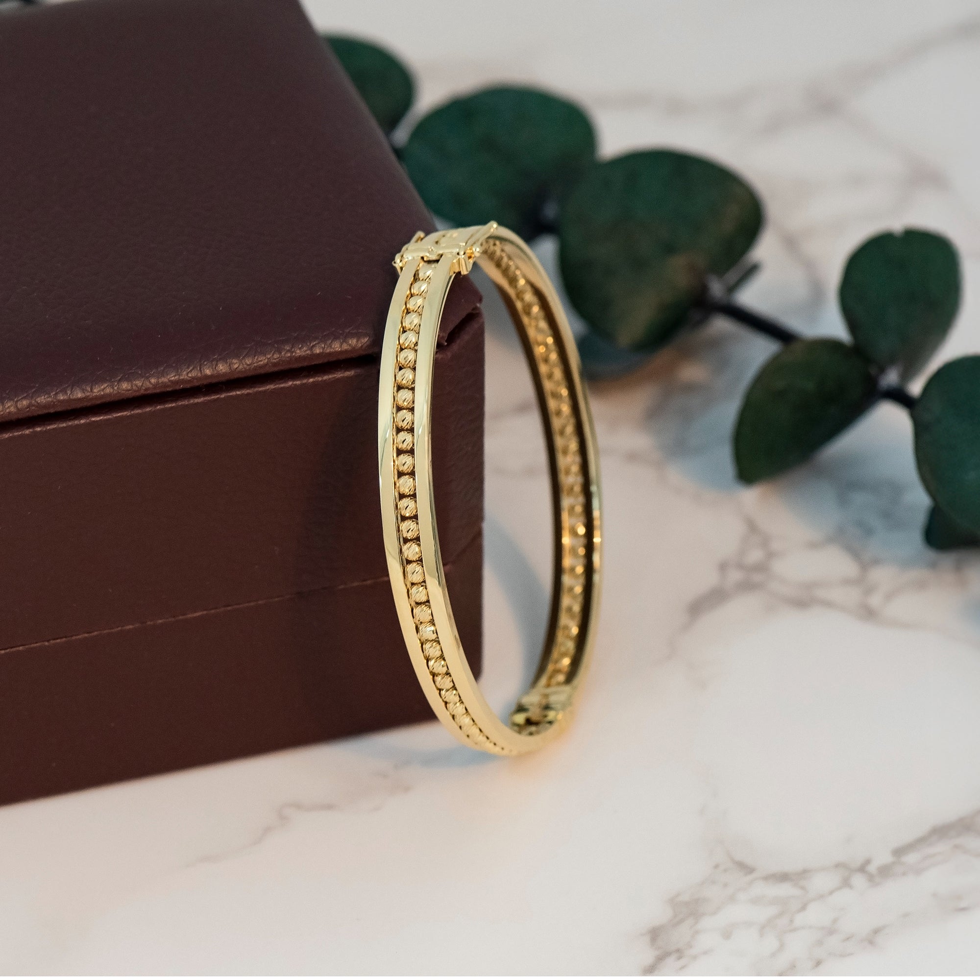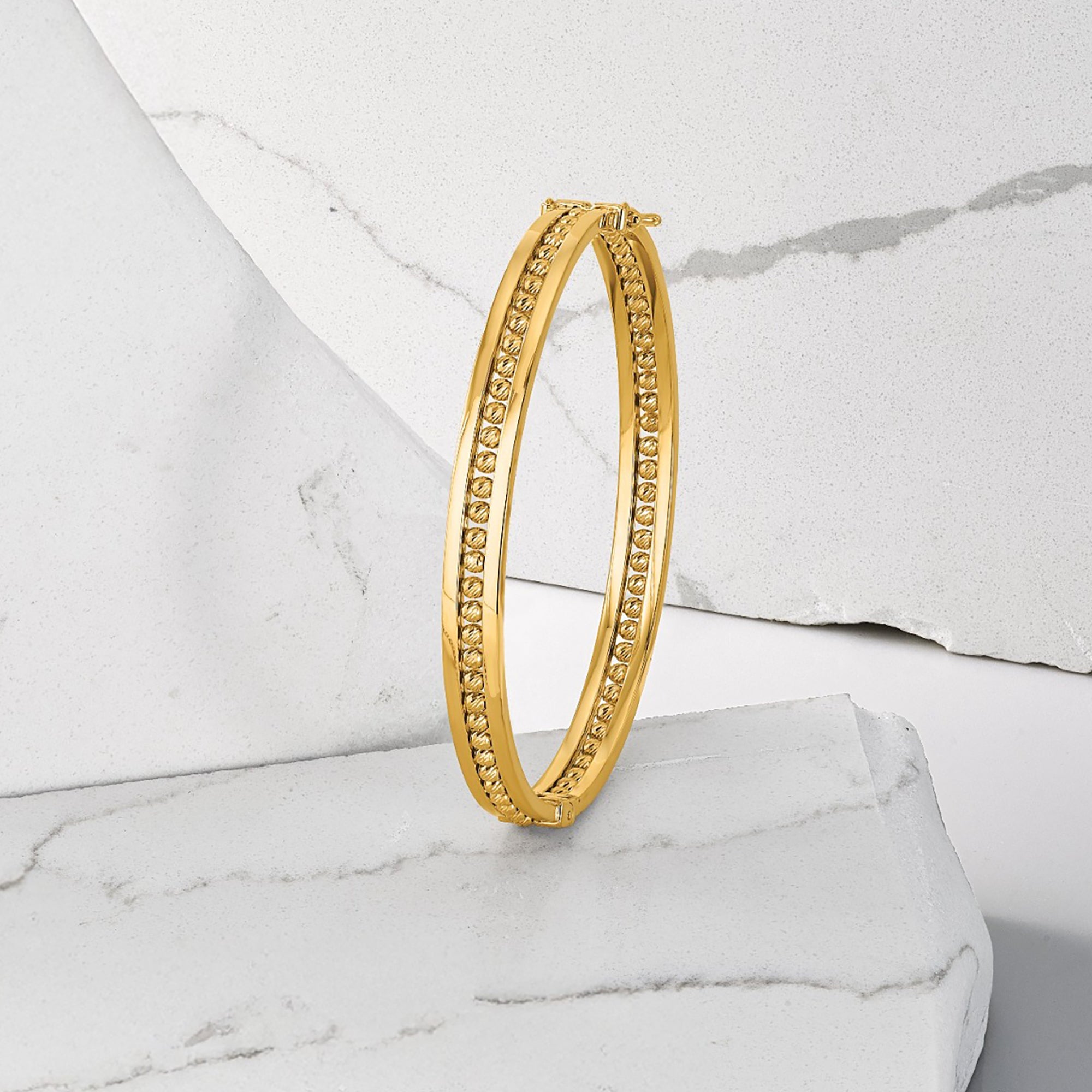 Add timeless elegance to your collection with this 14K Gold Diamond-Cut Beaded Hinged Bangle, a luxurious bracelet designed for women who appreciate classic style with a modern touch. Crafted in genuine 14K yellow gold, this bracelet features a polished surface accented with diamond-cut beaded detailing that reflects light beautifully from every angle. The hinged design offers both security and comfort, making it easy to wear while ensuring durability for everyday use.