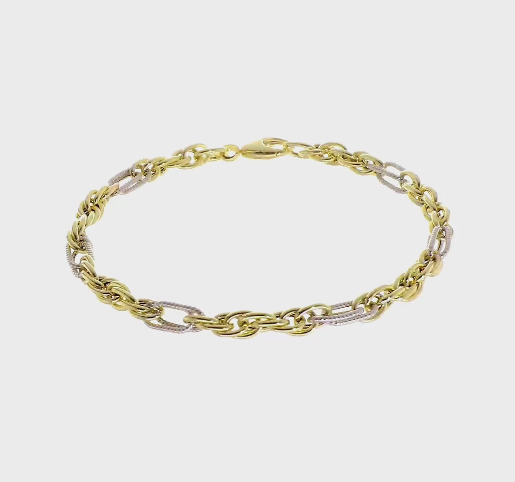 This 14K solid gold rope chain bracelet is expertly crafted in Italy, showcasing timeless design and exceptional craftsmanship. Featuring an intricate twisted rope pattern with a high-polish finish, this bracelet reflects light beautifully while offering durability for everyday wear.