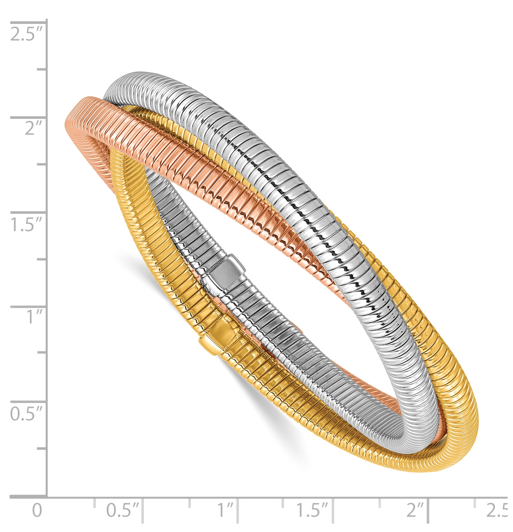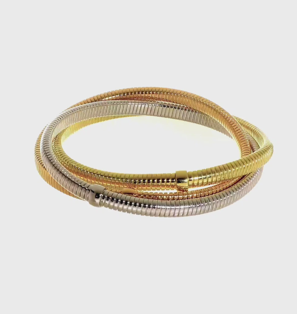 Elevate your jewelry collection with this stunning 18k Gold Triple Tubogas Bracelet, crafted in a luxurious tri-color design that effortlessly combines yellow, white, and rose gold tones. Its flexible stretch and slip-on style make it easy to wear and comfortable for daily use, while its sleek, modern aesthetic ensures it stands out as a statement piece.