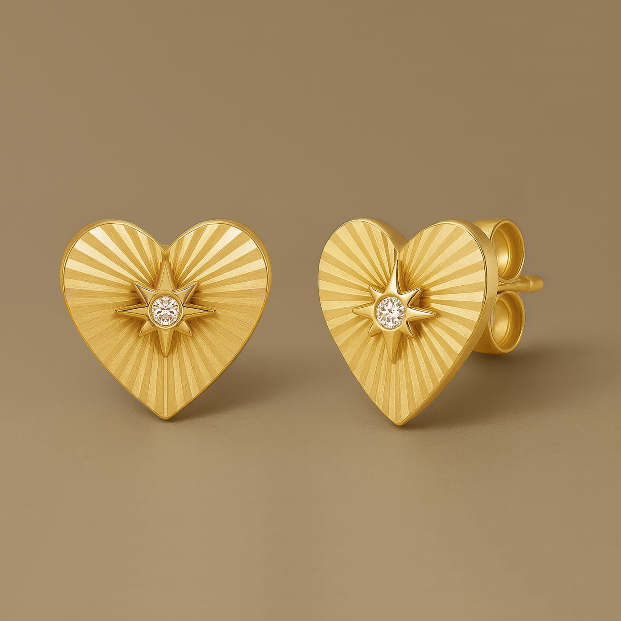 Illuminate your look with these exquisite 14K solid gold fluted heart stud earrings, featuring a radiant North Star design accented with premium cubic zirconia. Each earring is meticulously crafted to capture light beautifully, with a soft fluted texture that enhances the natural brilliance of solid gold.