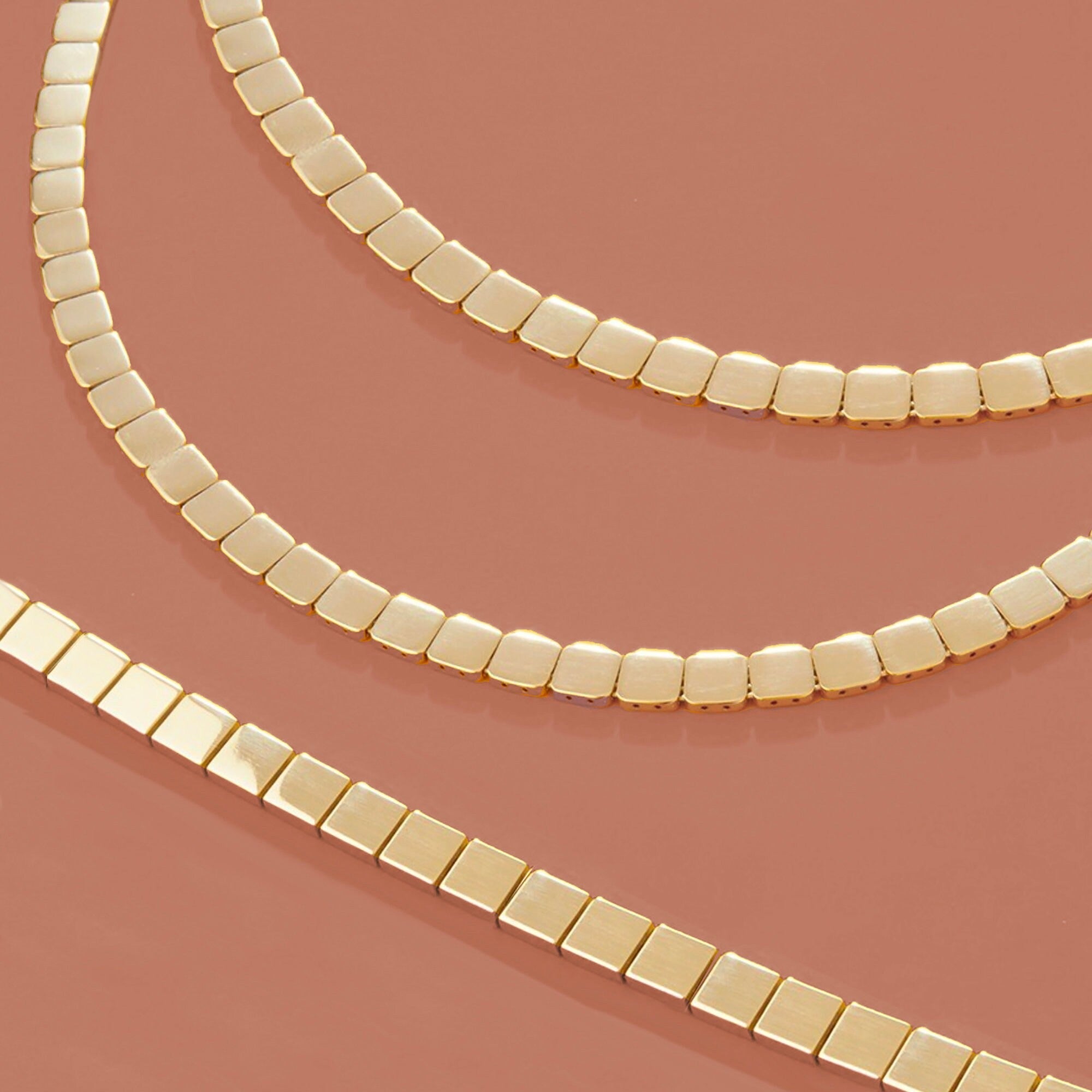 Indulge in modern sophistication with our 14K Gold Square Cube Link Chain Necklace. Crafted with precision and elegance, this necklace features distinctive square cube links that effortlessly blend contemporary design with timeless allure. Made from genuine 14K gold, it radiates opulence and enduring beauty. Whether worn solo for a minimalist statement or paired with other pieces for a stacked effect, this necklace is versatile for any occasion. The secure closure ensures a comfortable fit, allowing you to showcase your unique style with confidence.