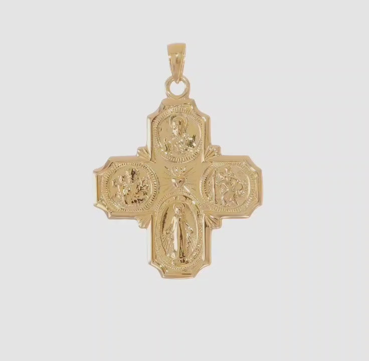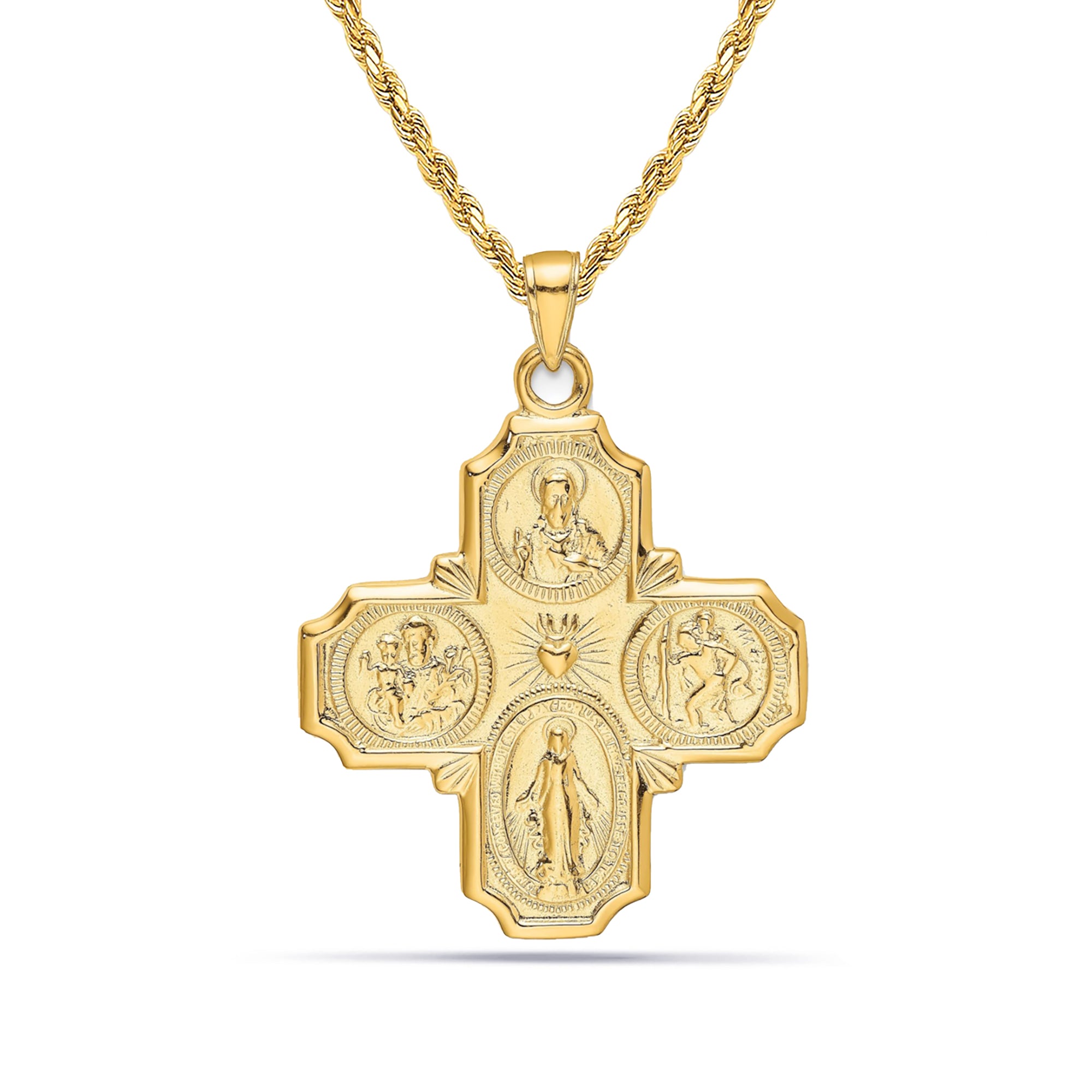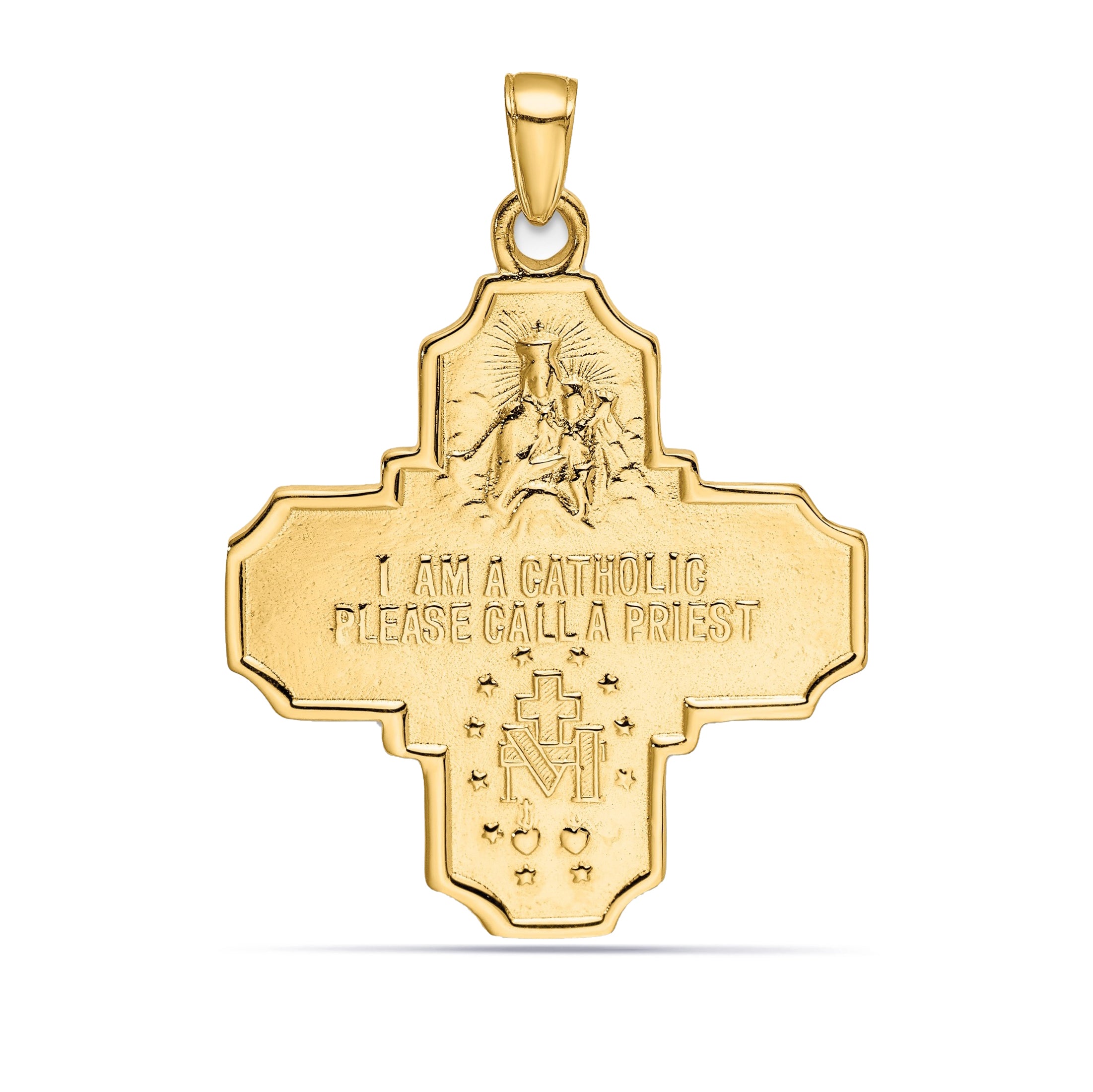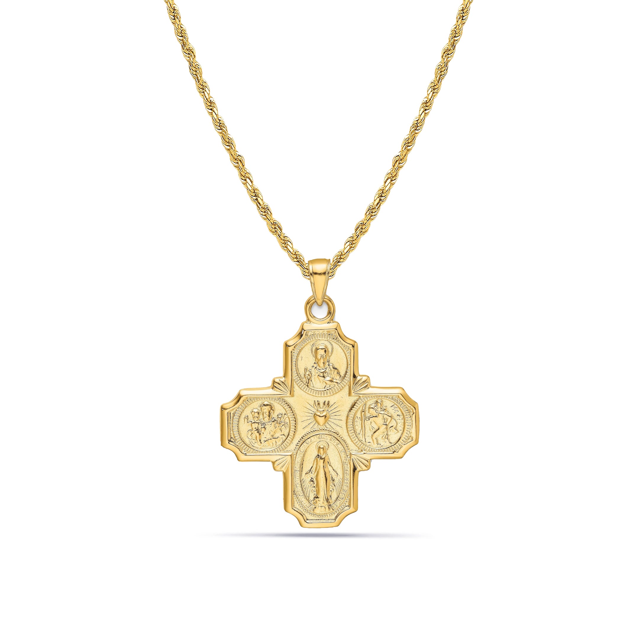 Honor your faith with this 14K Solid Gold Four-Way Cross Pendant, a powerful symbol of devotion, protection, and Catholic tradition. This meaningful design combines four sacred images in one pendant: