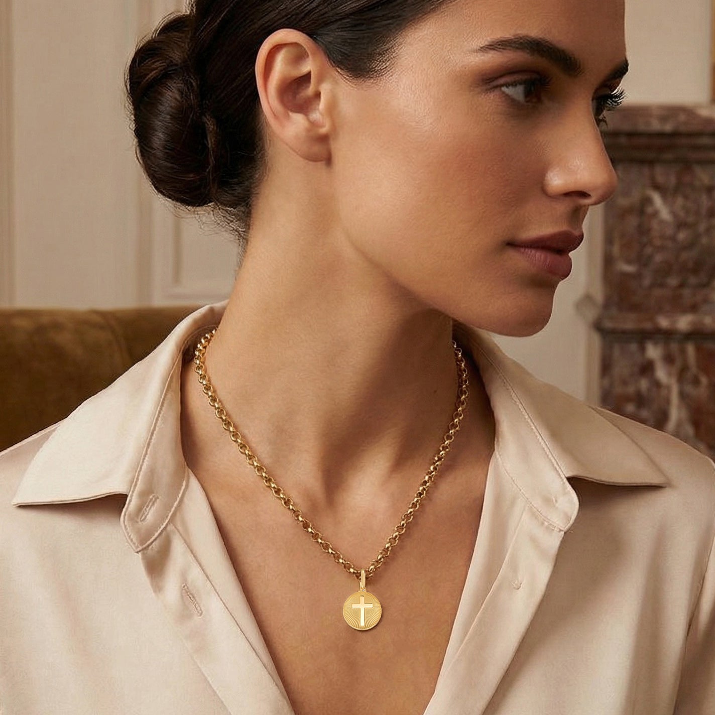 Expertly crafted in genuine 14K solid gold, this round medallion features a polished raised cross set against a finely fluted sunburst background, designed to catch and reflect light from every angle. The dimensional texture creates a luminous glow, giving the pendant a refined yet powerful presence.