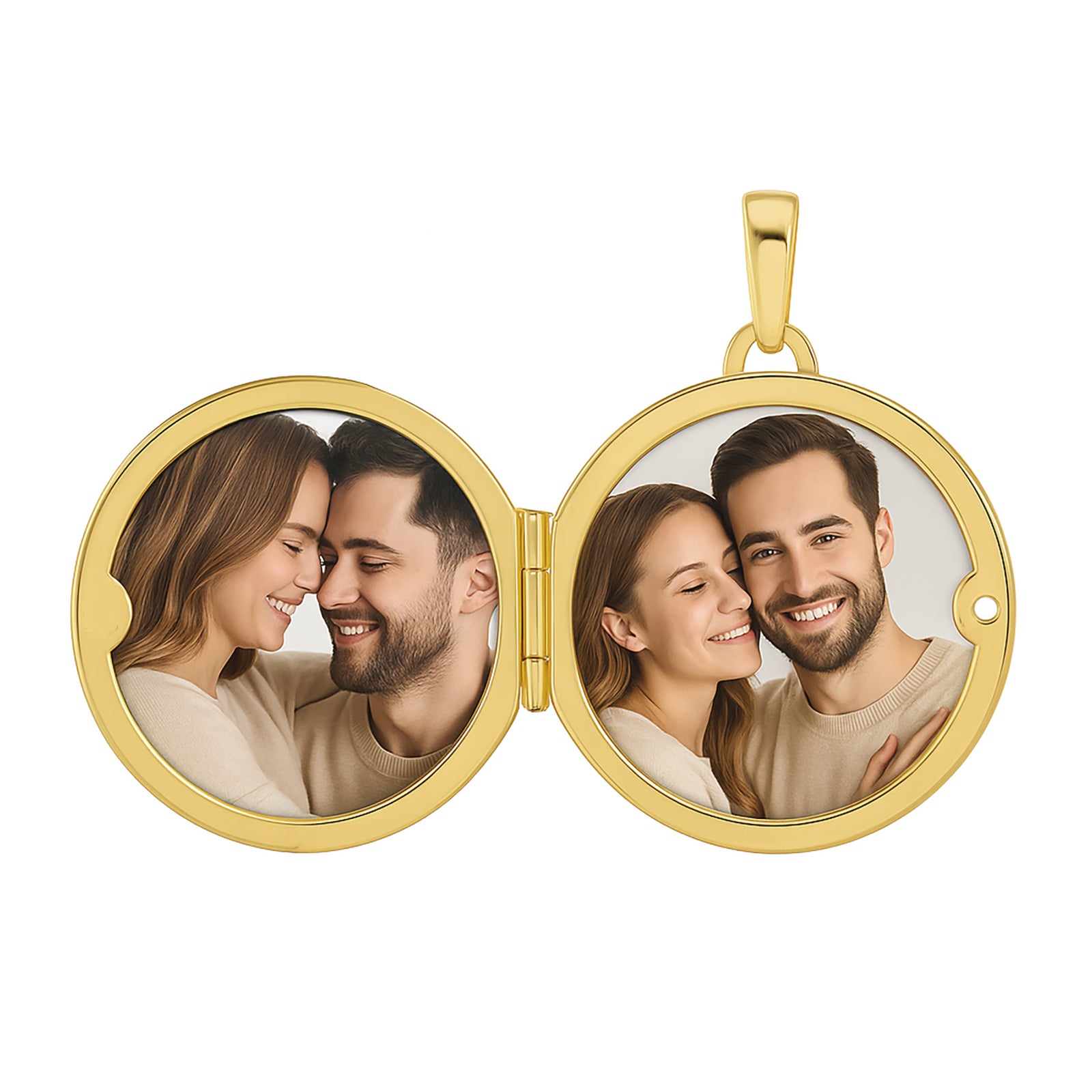 The smooth, high-polish front and back offer the perfect space for personalized engraving, while the interior opens to hold two meaningful photos or tiny keepsakes. This piece blends timeless elegance, spiritual symbolism, and heirloom quality — a keepsake designed to last for generations.