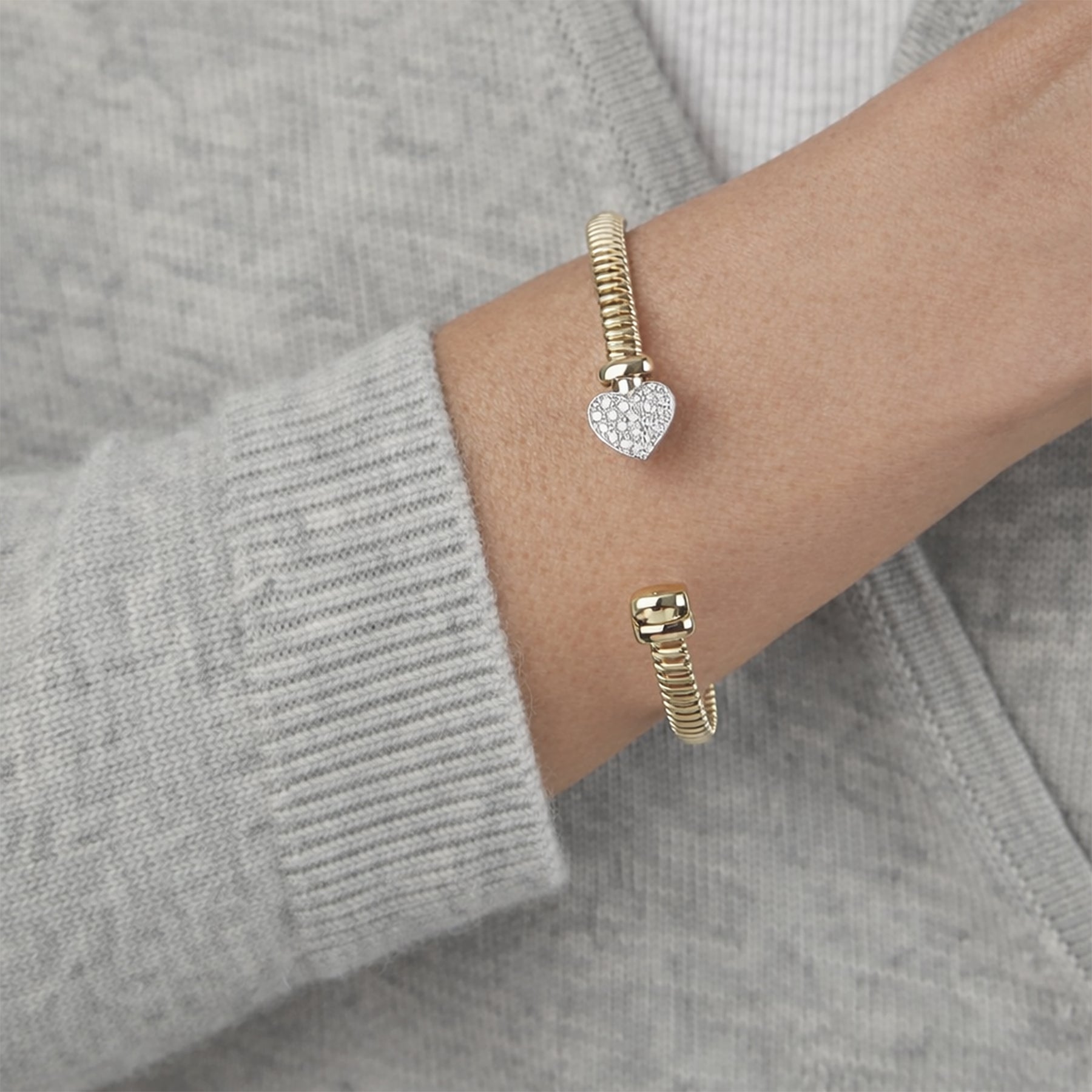 Designed for effortless wear, this gold coil bangle offers flexibility, durability, and timeless shine. Perfect worn alone or stacked, this luxury gold heart bracelet makes a meaningful gift for her and a refined everyday statement in fine jewelry.