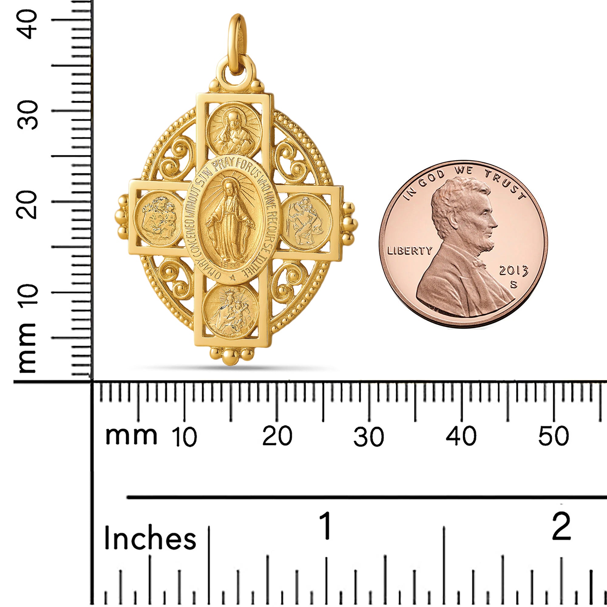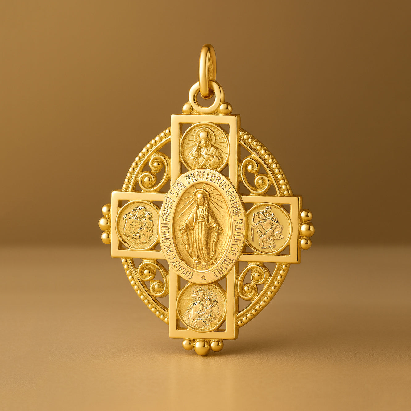 The ornate filigree goldwork and raised relief create a luxurious vintage look while preserving every sacred detail. Whether worn daily or gifted as a meaningful keepsake, this Four-Way Medal is a treasured expression of faith, guidance, and protection for both men and women.