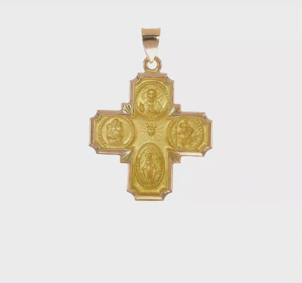 Honor your faith with this beautifully detailed 14K Gold Four-Way Cross Pendant, a timeless Catholic medal cherished for generations. Expertly crafted in solid 14K gold, this pendant features four beloved icons: Sacred Heart of Jesus, St. Christopher, St. Joseph, and Our Lady of the Miraculous Medal, centered around the radiant Holy Spirit. Each element is precisely engraved, creating a meaningful piece rich in tradition, protection, and devotion.