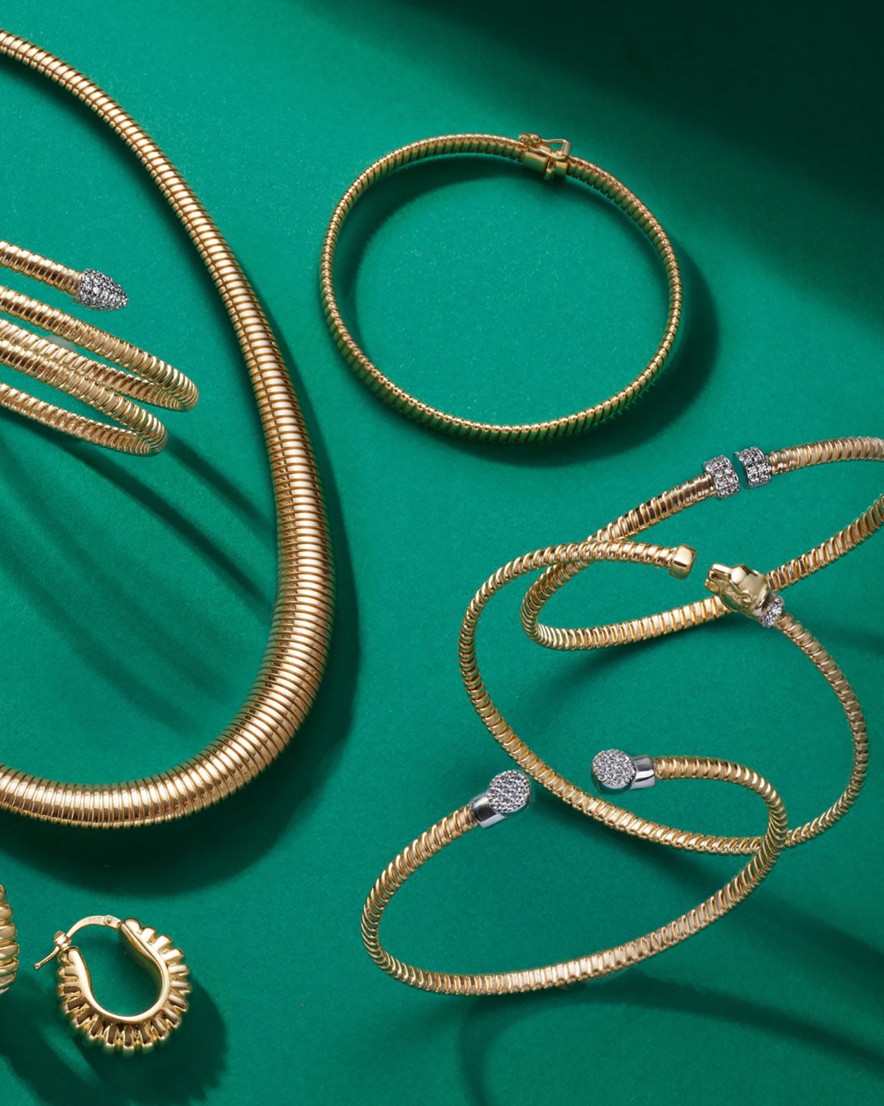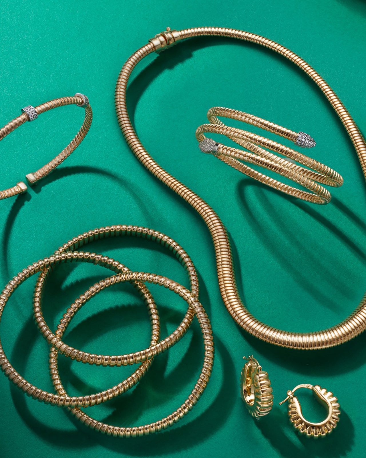 Polished to a radiant shine, this luxury gold coil necklace sits beautifully along the neckline, making it a striking standalone statement or a refined layering piece. A timeless essential, this graduated Italian gold cobra necklace transitions effortlessly from day to evening wear.