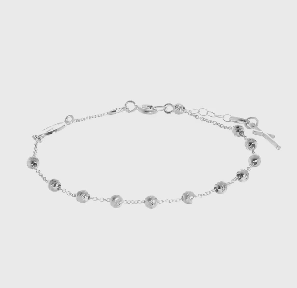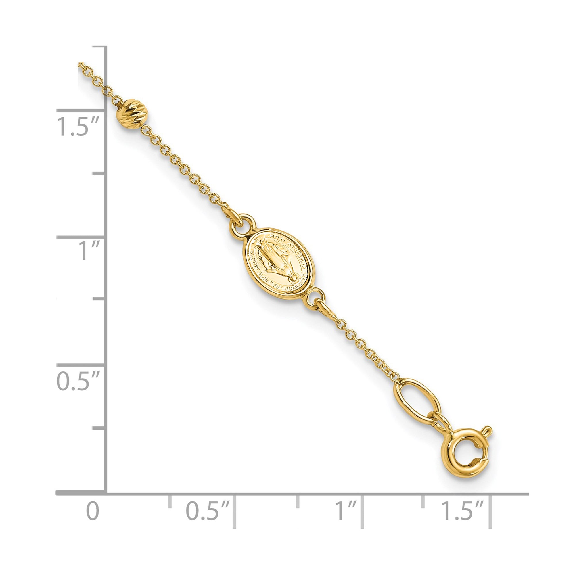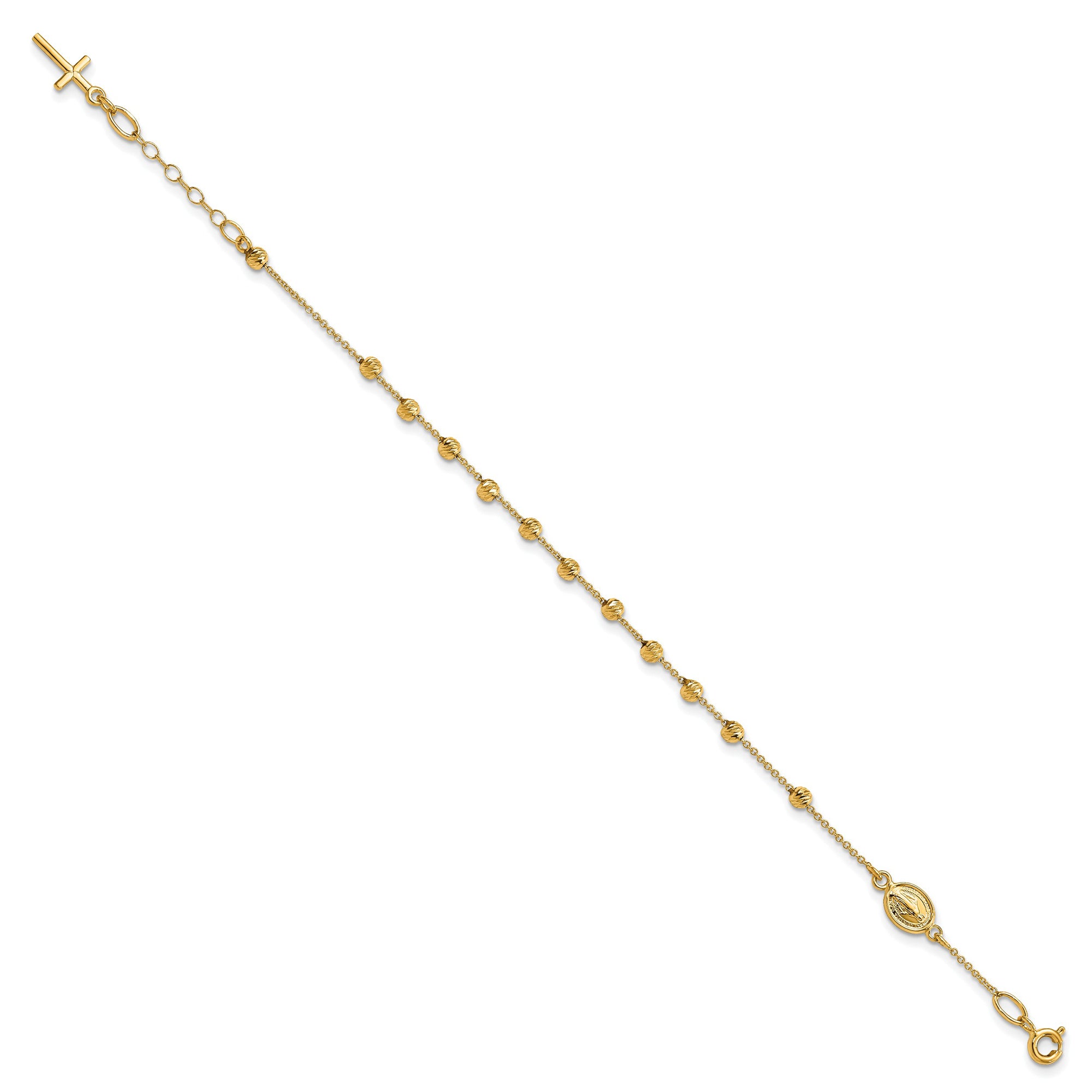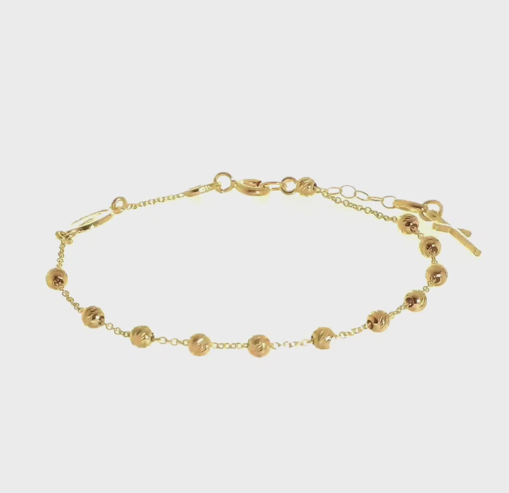 Elegant 14K gold rosary bracelet with diamond-cut beads, cross & Miraculous Medal charm. A timeless spiritual keepsake, perfect for gifting.